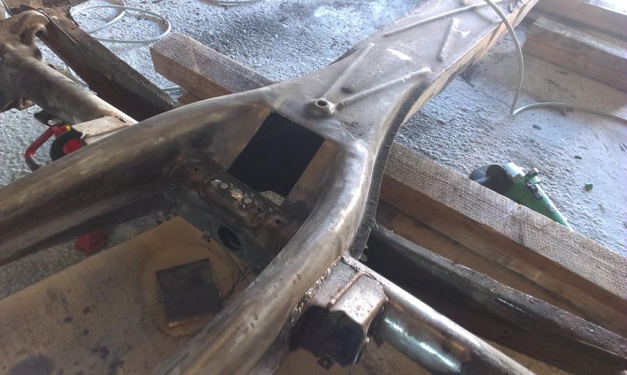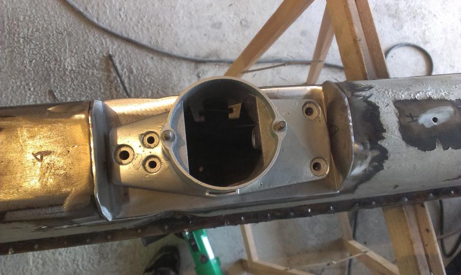 Donc, coupe coupe on fait un gros trou, et on découpe dans la bonne tole de 4 ou 5mm le fond et les côtés : Et une belle découpe comme celle de la porsche, et trois trous pour la fixation du levier : J'ai profité du gros trou pour faire le ménage dans la poutre : Puis je soude par dessous les écrous de fixation du levier, et les 3 plaques ensemble. J'ajuste, et hop, points et cordons... en s'appliquant! Un coup de barbouille phosphatante, et validation du montage... C'était le 7 janvier