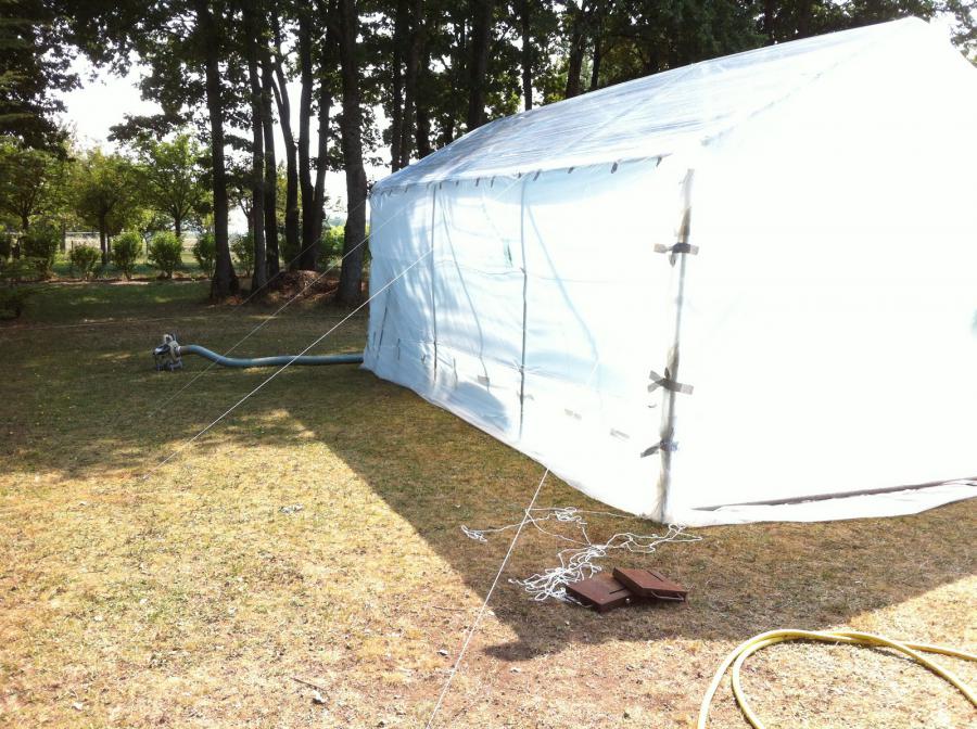 le toit est recouvert de film a palette (dessus/dessous) pour éviter les infiltrations d'eau de pluie et avoir une bonne luminosité, une grand bache au sol et 4 pans fermés