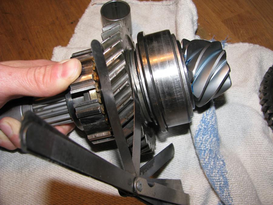 La suite montage des pignons sur l'arbre secondaire, montage du pignon de première avec les aiguilles Berg: Montage moyeu baladeur et réglage du jeu de la première: Baladeur et synchros neuves: Puis pignons de 2 et de 3 toujours avec les aiguilles Berg: