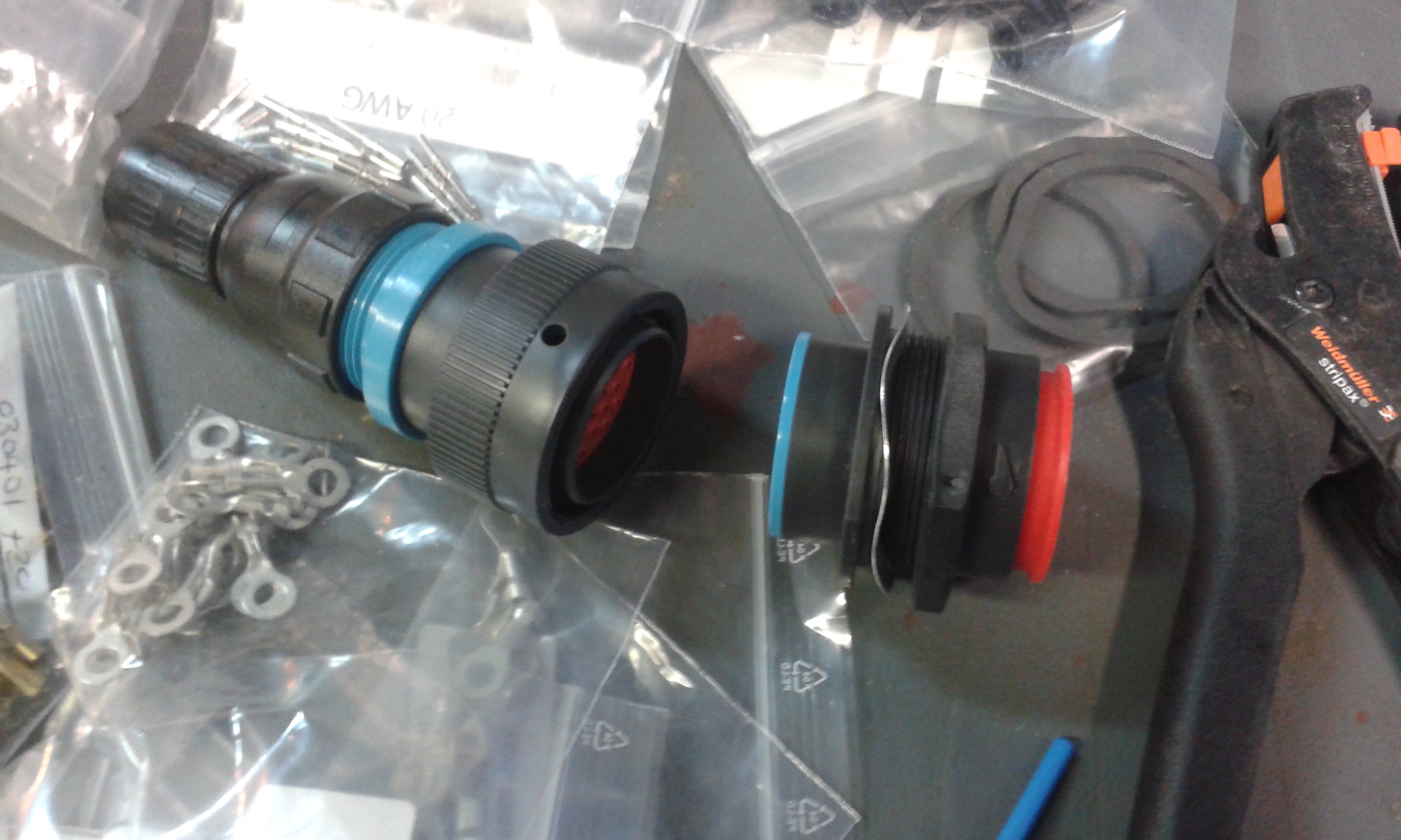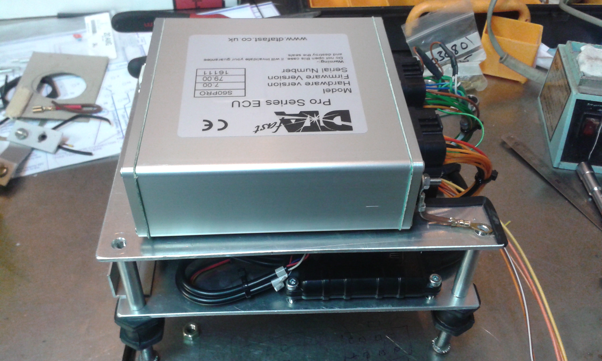 Pour que tous les éléments soient au même endroit j'ai créé une platine à 2 étages, le premier reçoit les relais, fusibles, capteur barométrique, l'Innovate LC2 (sonde lambda) et les jonctions communes. Le deuxième étage reçoit le calculateur DTA S60. Ce module se trouvera derrière la banquette côté conducteur pour relier tout ce petit monde au moteur j'ai choisi un connecteur Deutsch à 31 voies étanche de la gamme industrielle/PL/agricole car la gamme Motorsport est vraiment plus chère, surtout l'outil de sertissages des pins qui avoisine les 600€! La tôle au dessus de la boite de vitesse est percée pour fixer la partie de la prise fixe, il y aura que 2 prises pour enlever le moteur: le connecteur Deutsch et la prise de l'alternateur.