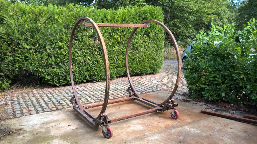 Voilà la rôtissoire, 360* de rotation, version mobile avec les grandes roues industrielle pour la transporter chez le sableur ou le peintre, 2m de haut et 1,9 de large , ca rentre dans une remorque plateau sans soucis, il me reste à presenter la voiture dedans pour faire les supports amovibles qui permettront de mettre la coque, le chassis où les deux en même temps , mais c'est pas pour tout de suite car je sais plus bouger scooby, roulements de moyeu av arraché, c'est de ma faute, il était déjà loin quand j'ai acheté la subaru et je l'ai laissé longtemps sur son poids sans cardans fixé, ca devait arriver ;)