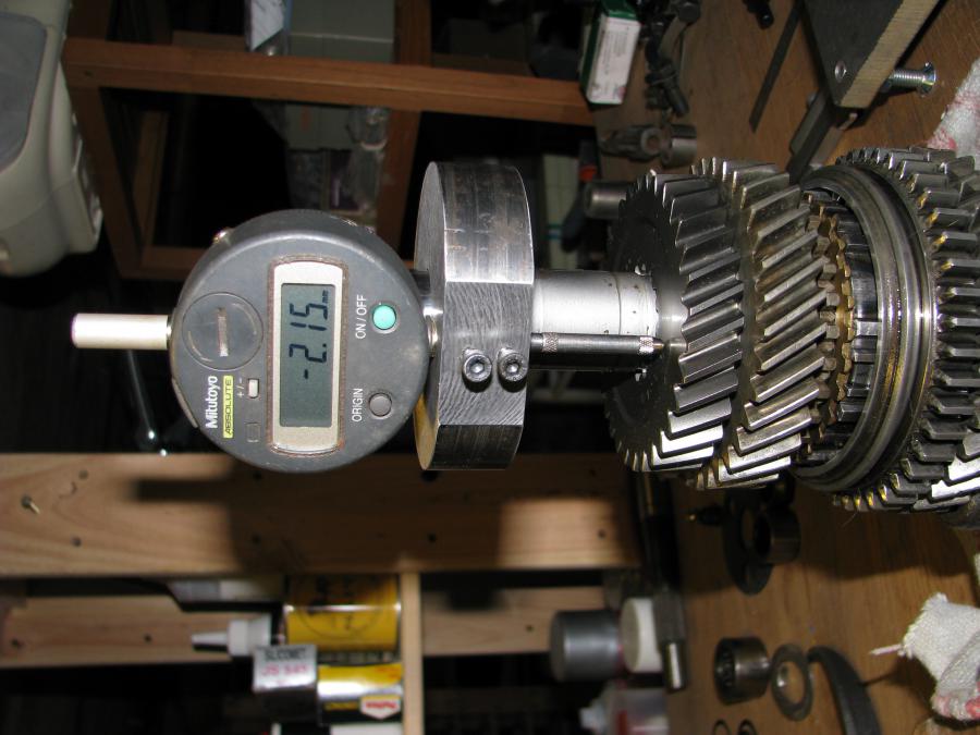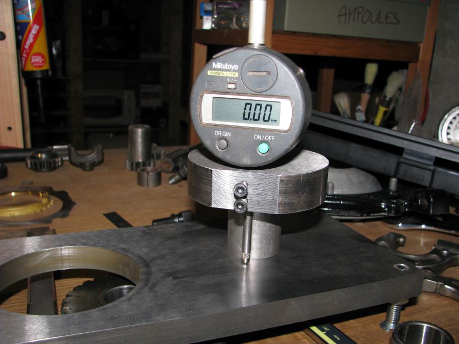Fabrication d'un outil de mesure et réglage à "0" avec l'entretoise: On pose l'outil de mesure sur l'épaulement de l'arbre où viendra en appui le pignon de quatre: soit 2.15mm de jeu entre l'entretoise et le pignon de 3; je retire 1.26mm de la rondelle belleville se qui me fait un calage de 0.89mm à faire.