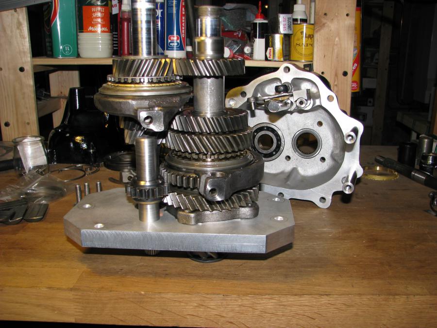 Les deux arbres sur le gabarit pour le montage du carter intermédiaire (je ne détaille pas le montage des fourchettes de commande c'est comme pour un carter d'origine): Un petit coup de presse: La bague du pignon de 5ème à la presse aussi: Pignons de 5ème en place: Et enfin le moyeu et baladeur: Il ne reste plus que le réglage des fourchettes: Petite vérification avec le nez de boite pour valider les réglages