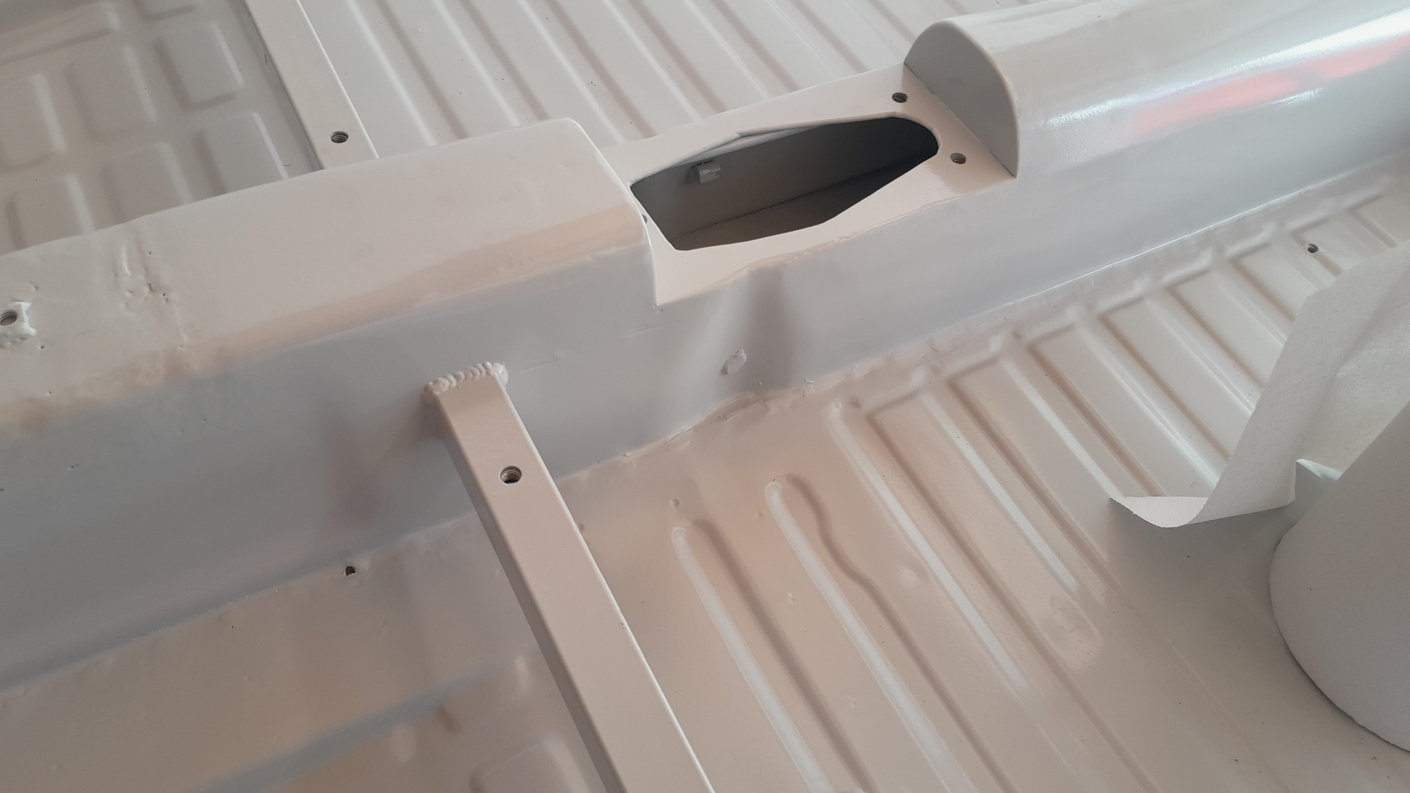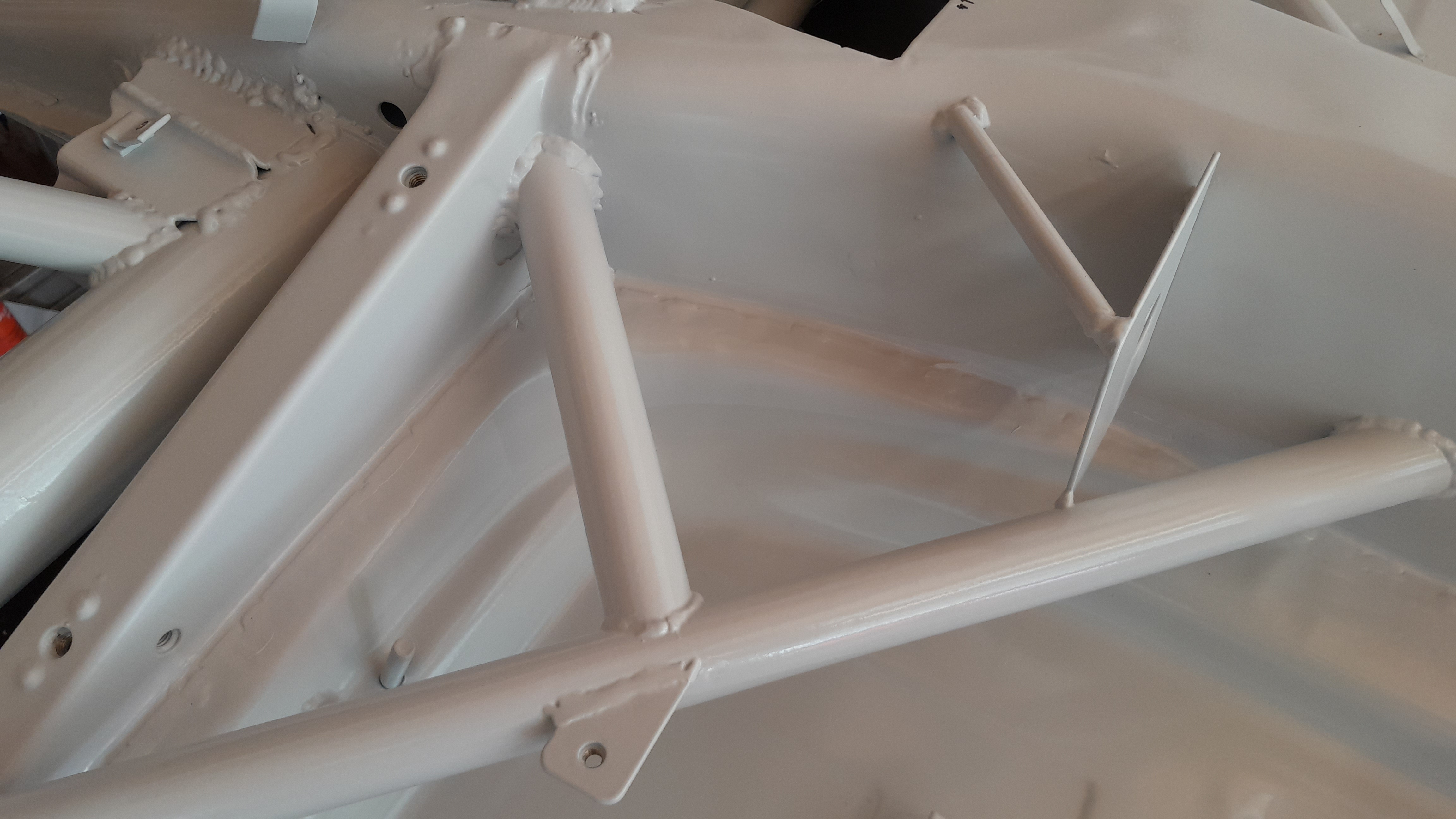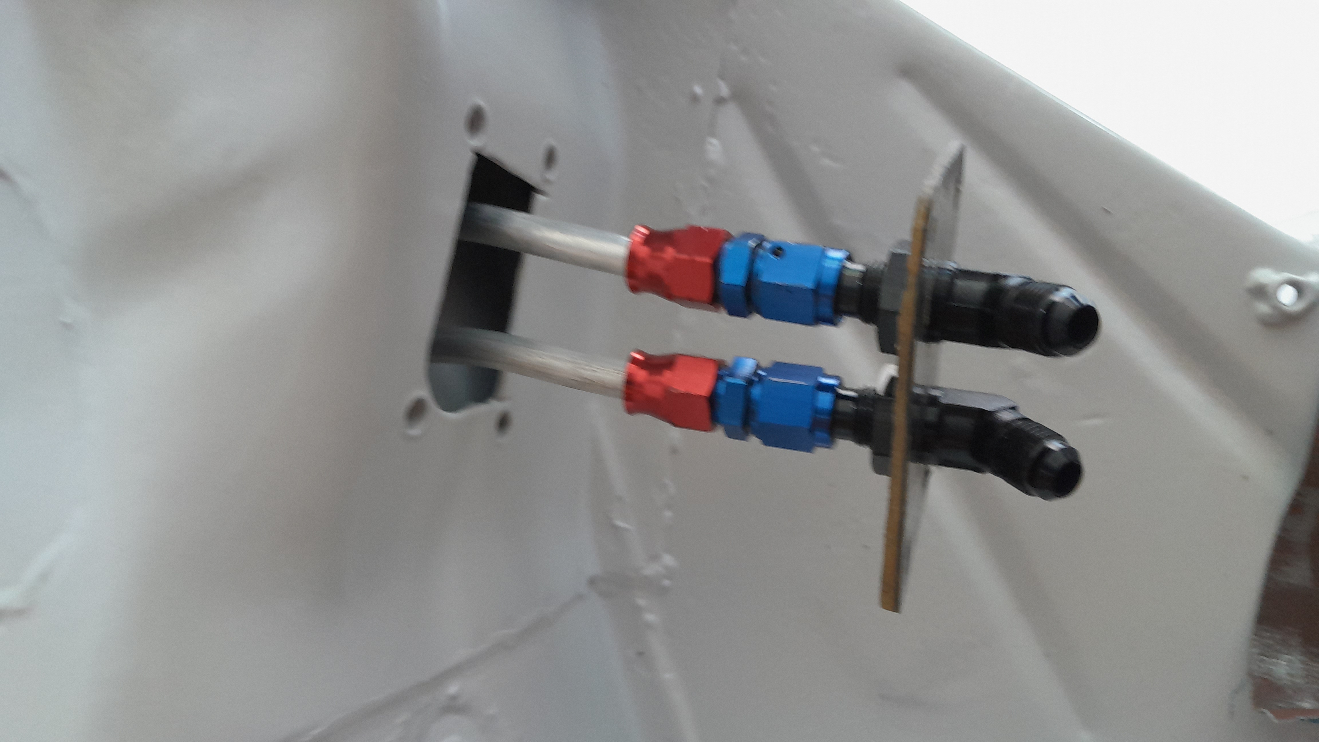 Avec du mastic blanc, et une peinture epoxy de retouche du même RAL, on fait des miracles... Et j'ai attaqué le remontage... ligne d'essence en alu avec raccords Dash, et coupleurs à l'arrière. Pour démonter le moteur sans foutre de l'essence partout.
