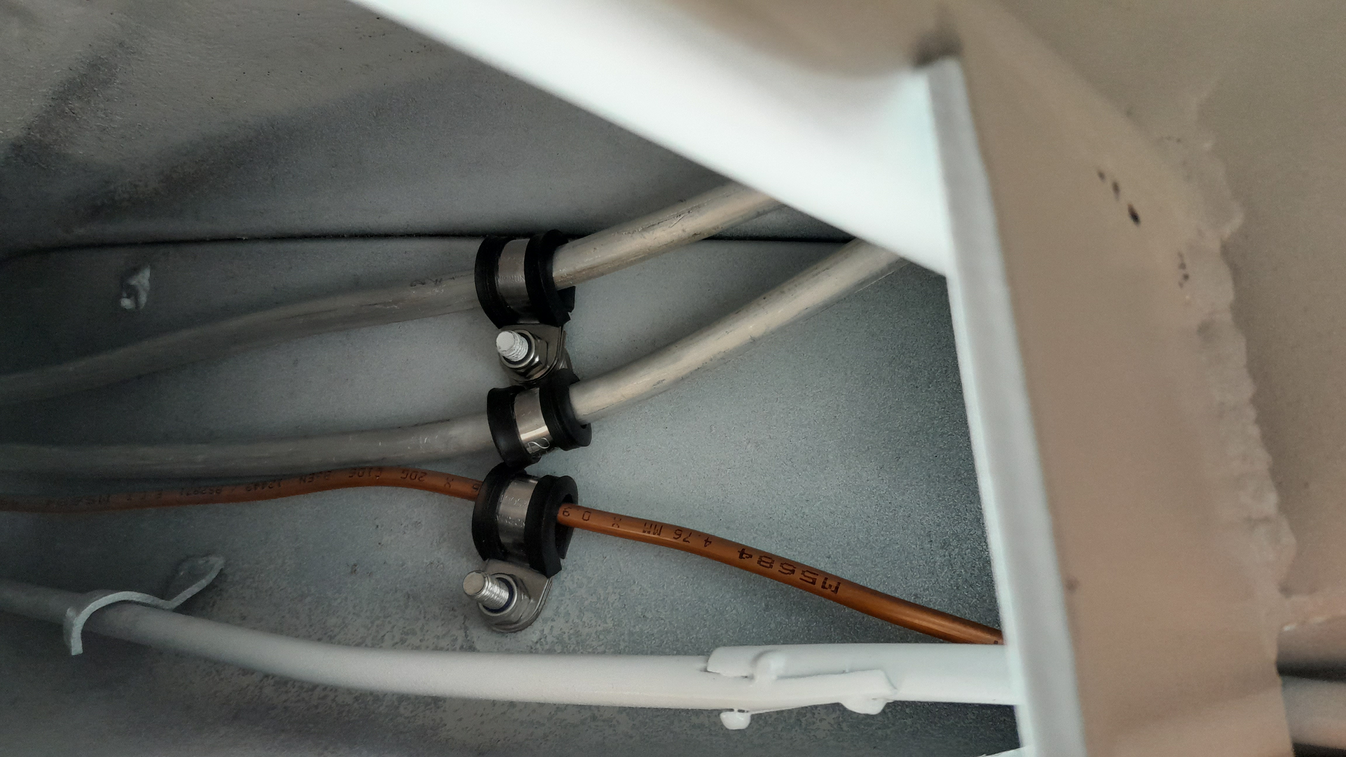Ligne d'embrayage en cuivre, collets faits maison, passage dans la poutre.