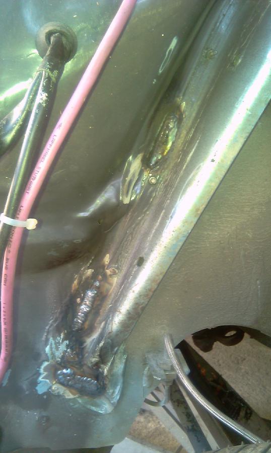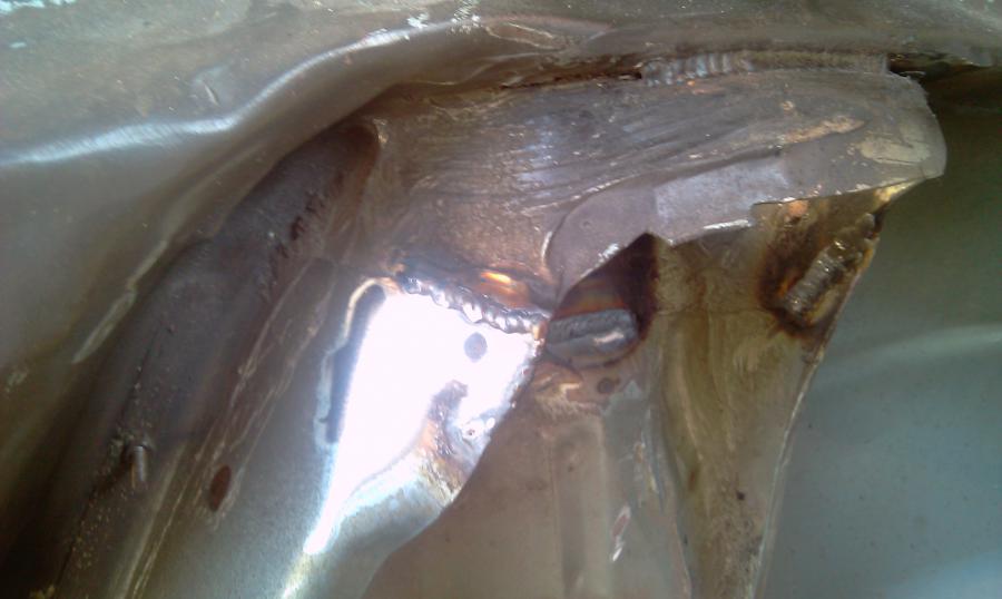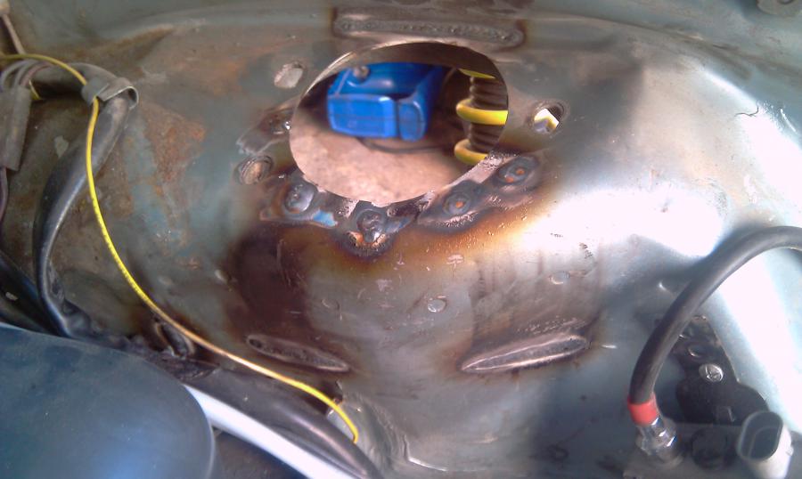 Maintenant et pour finir, afin d'éliminer le problème connu que Dangerous a soulevé dans un autre sujet sur les renforts, il faut s'occuper de pointer la partie supérieur du puit au flanc lui-même. D'origine, c'est deux pièces sont passablement ajustées et avec le temps, le flanc se déforme et la tôle encaisse. Le dôme de puit a au moins 10 points sur le montant de flanc et seulement 2 sur le dessus. Résultat, le dessus gondole....