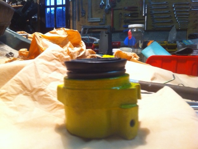 Petit rappel mes freins avant Voila tout les éléments donc premier truc à faire c'est de remettre le joint dans la gorge, je le monte avec un peu de liquide de frein pour faciliter la mise en place du piston: on place le colliers pour maintenir le soufflet. et voila deux étriers tout neuf