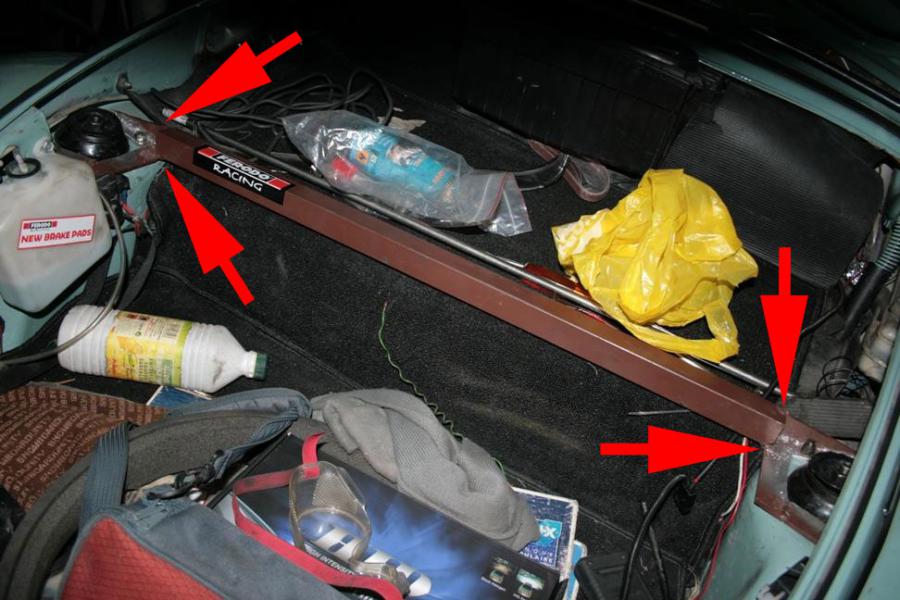 Je l'ai faite en plus de son utilité antirapprochement, pour pouvoir tenir sur la partie reservoir du coffre des choses comme des cartons, vilos, cullasses, boite de vitesse... ou des trucs bien lourds, ou les sangler sur la partie basse, sans qu'ils ne tombent, butent dans le capot ou tordent une barre type rotules+tube de 10mm. Et même avec une boite de vitesse (voir 2) sous le capot, j'allume comme quand je roule à vide. Et j'ai tendance à souvent les y garder une semaine.