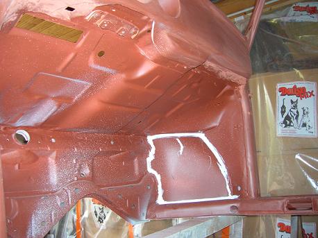 pour l'emetteur du frein a main,fabrication d'une plaque en tole de 5mm d'epais au profile interieur de la poutre centrale ,liberation des differents passage (commande boite,cables ......)ensuite decoupe de la poutre mise en place et ajustage de tous les elements et soudage definitif.