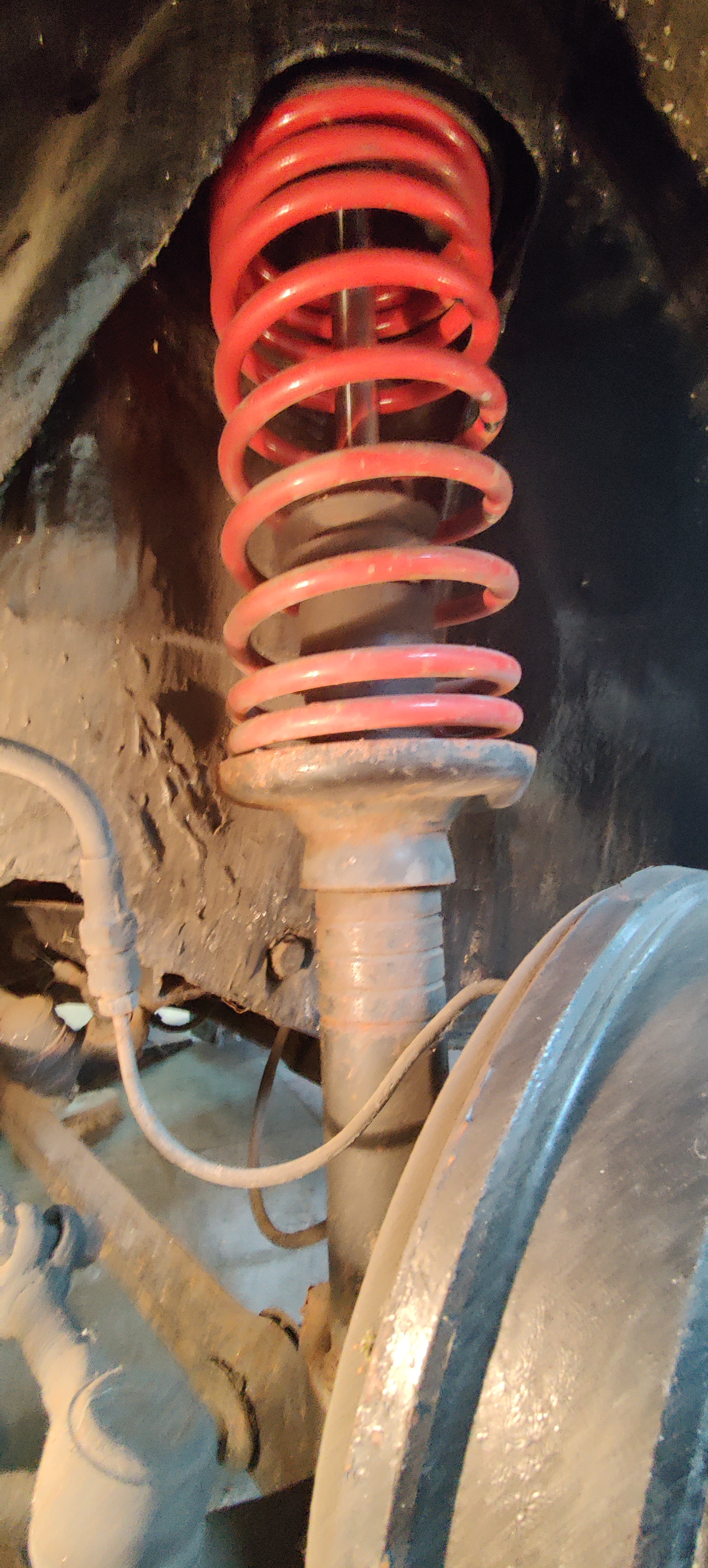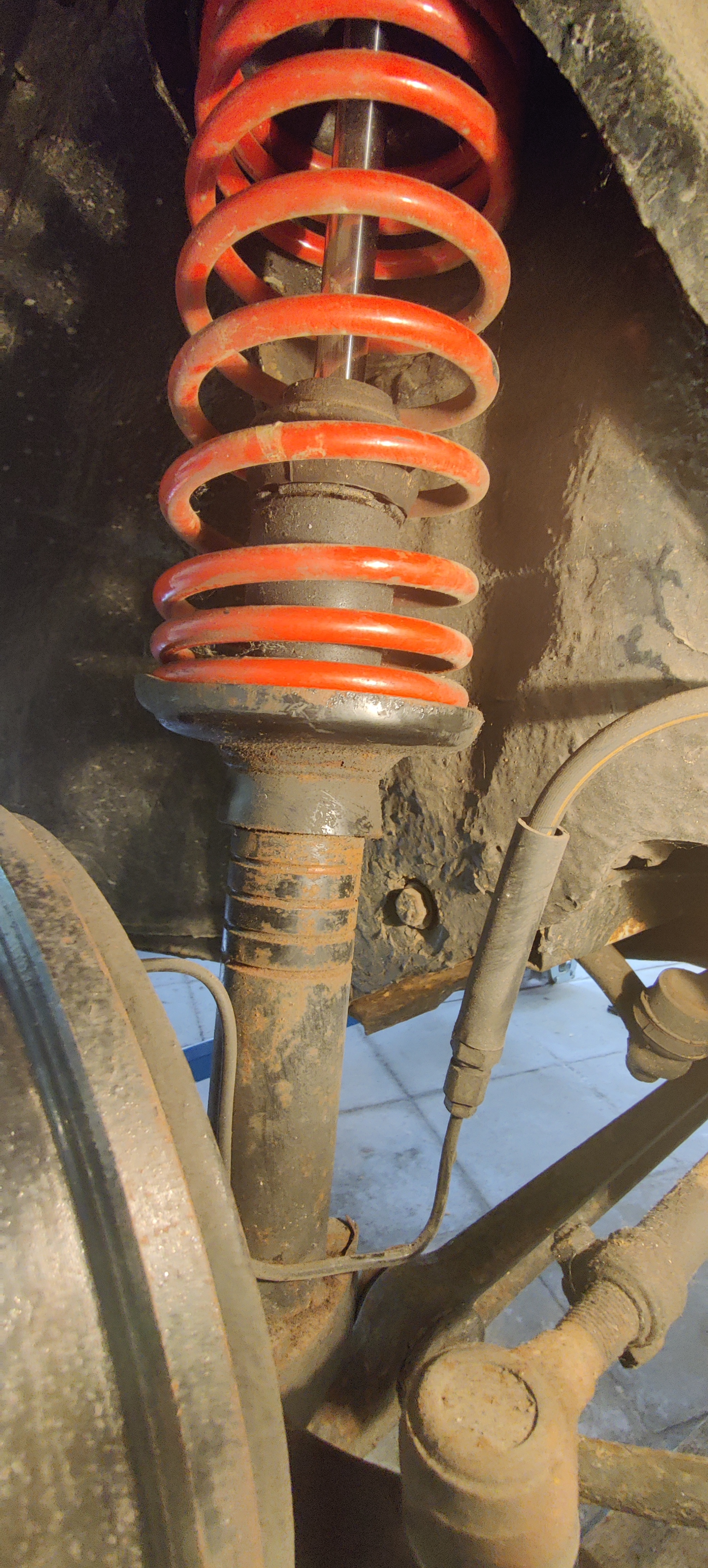 Je n'avais pas de cales assez épaisses pour ce petit test. A l'arrière ça touche l'écrou sur le bras de suspension, et probablement d'autres choses. A l'avant ça bute sur le ressort.