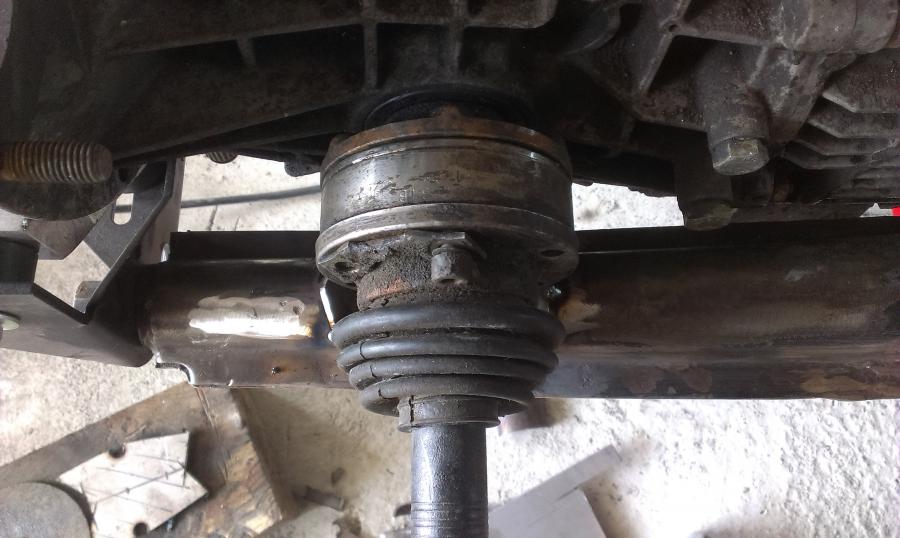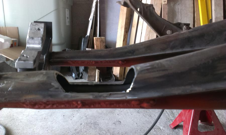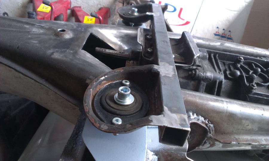 J'imagine une traverse basée sur des morceaux de traverse 915, qui reprennent les silentblocs d'origine. C'est peu orthodoxe, mais je n'ai pas une bonne cintreuse sous la main. Après validation de l'emplacement (un poil vers l'avant du châssis par rapport aux supports de bras obliques), je pointe et soude les supports qui reçoivent des écrous, afin de venir visser la traverse. C'est du 4 ou 5mm d'épais, bien rigide. L'ensemble n'est pas fermé, déjà pour accéder, mais surtout pour facilement traiter et éviter les dépots, et ainsi la rouille. ça ne me plaisait pas de percer les supports de bras... Vient ensuite la fixation à l'arrière, dans les supports alu Martin Bott. On bloque avec de bêtes serre-joints, et perçage!