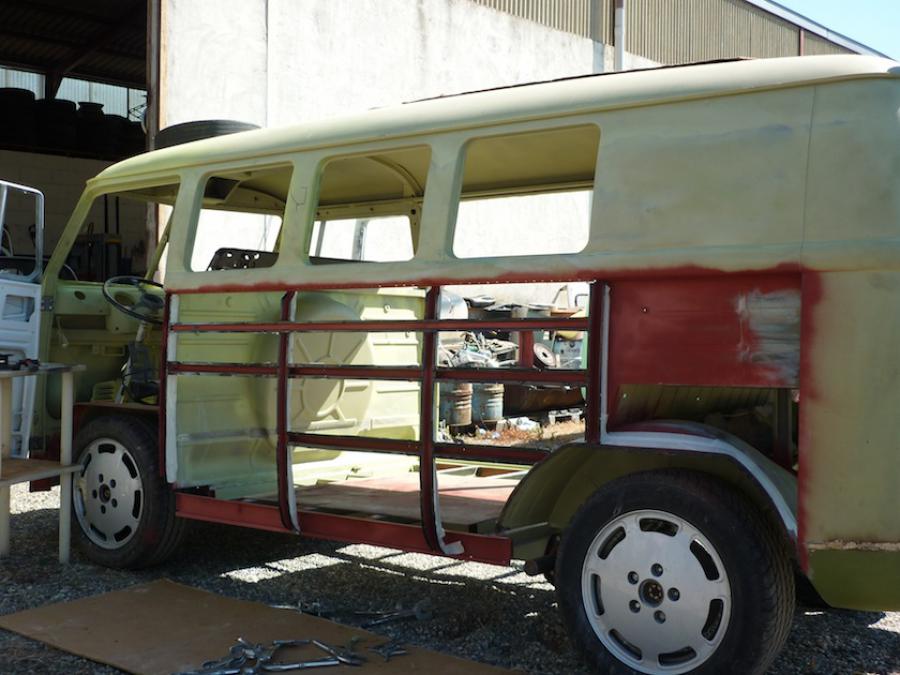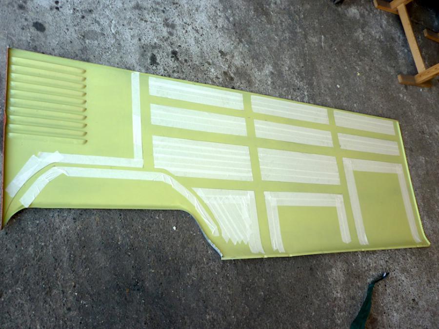 Sur le panneau les traverses sont repérés pour appliquer le primer et assurer un montage propre sans degoulinage de colle... Sur les traverses on mets egalement du primer et du scotch pour le surplus de colle apres pose! La colle est appliqué sur le panneau: Et zou! on remonte le panneau avec des pinces sur les partis ou il sera souder et on le laisse prendre sa place sur les traverses en validant la planéité avec une regle de 3m!! Et voila c'est propre! L'autre coté est en cours mais c'est une autre histoire car la planéité se fait entre le coin arrière, le panneau, chaque porte cargo et la porte passagé! Et là y a du sport!!! A suivre