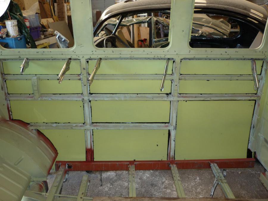 D'origine les panneaux sont pointés, mais faire des points de soudure en plein milieu on a pas jugé ça judicieux donc collage avec une colle especial pour les panneaux de carrosserie, en plus c'est plus rigide que le pointage et ça absorbe bien les vibrations, bref que du bonheur!