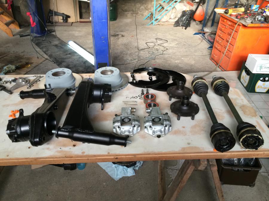 Les jambes de forces ont été changées car l’entraxe des étriers sont différents… toutes les tôles ont été epoxyées et les pièces traitées avant montage… Sauf la barre stabilisatrice. Je vais remédier à ça plus tard !