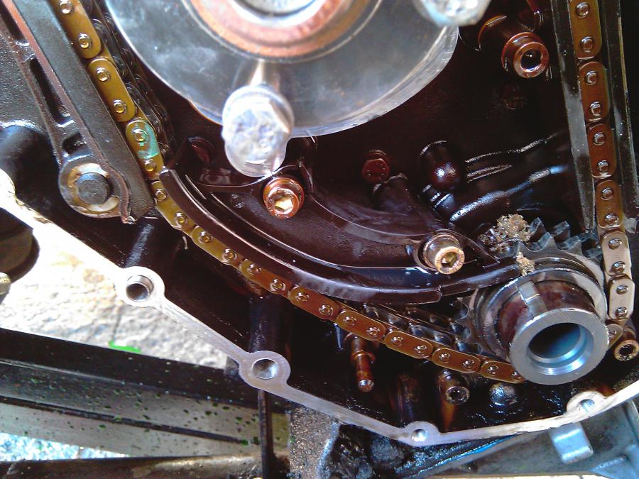 bah j'ai l'AAC d'échappement qui s'est décalé d'une dent, c'est d'ailleurs la cause de la casse du guide supérieur, la chaine a fait sa place. Donc et bah, il faut que je change le carter AR de pompe à huile.