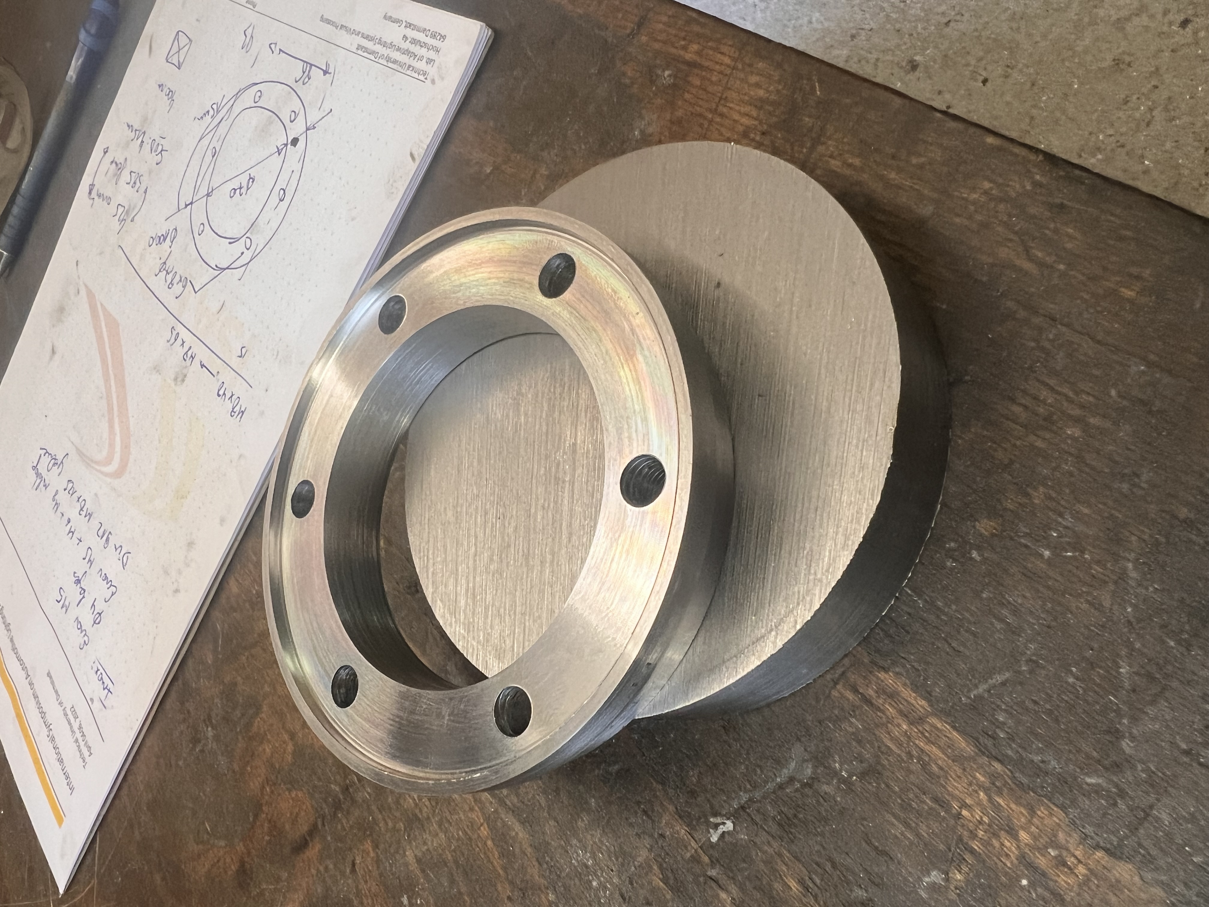 La modif du cardant cox pour recevoir les noix 944 turbo, et je fabrique une entretoise en acier costaud, usinée avec precision sans quoi les vis M8 qui se retrouver allongée de 15mm par rapport a l origine plient