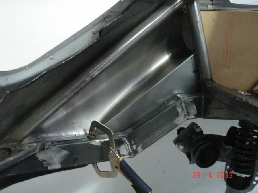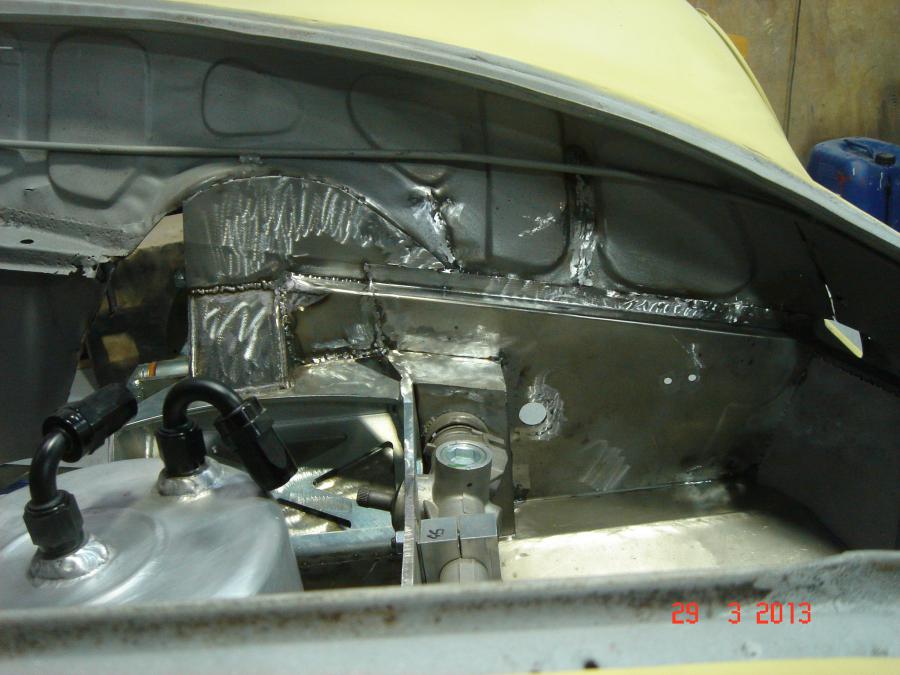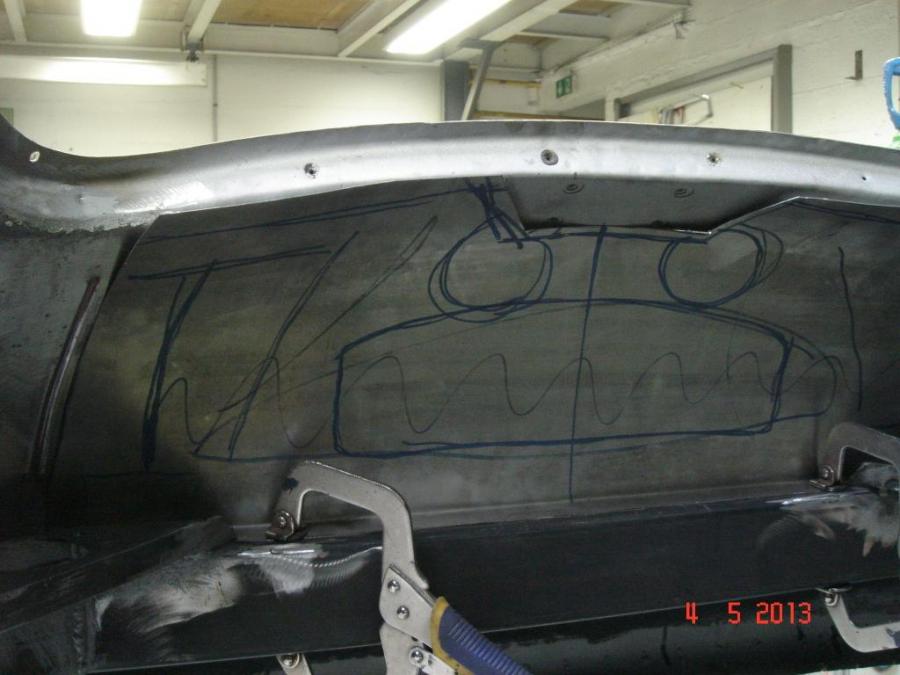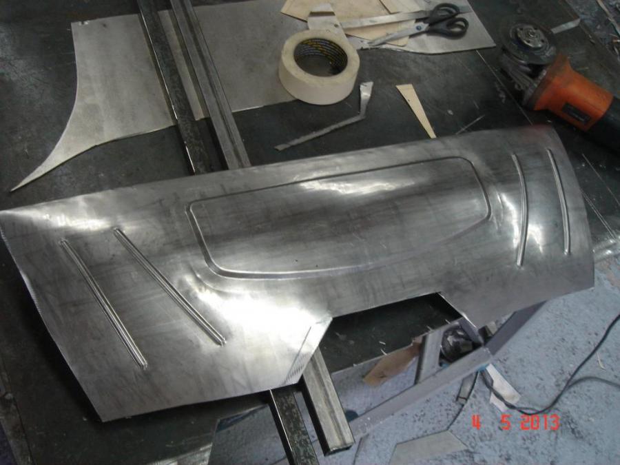 La cloison ayant été reculé de 17cm elle aura maintenant la même forme que sur une C (avec un angle), je garde les charnières de capot d’origine et je ferme tout autour et garde une grande trappe de visite. Et je m’attaque a l’une des tôles les plus dure , celle derrière le moteur car elle est galbé dans tous les sens et que je lui loin de savoir me servir de la roue anglaise . mais âpres 3 heures de façonnage ca commence a très bien collé Alors je dessine les renforts et a la rouleuse et je soude enfin passage a l'epoxy gris sur toutes les soudure pour un filet de mastique alu sur les soudure pour avoir une belle finition