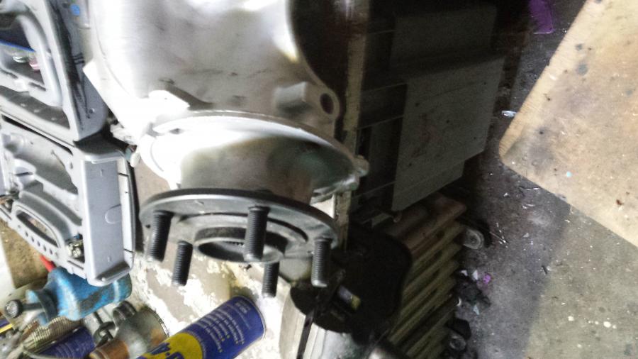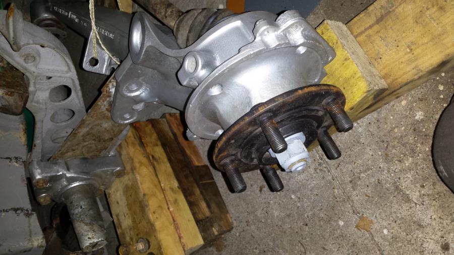 déjà j'ai commencé par enlever les anciennes bagues des roulements et bien nettoyer les moyeux ensuite j'ai accouplé bras et moyeux J'ai monté les bras sur la voiture aprés avoir mis les cardans et serré l'écrou pour tenir les roulements. Vu que la boîte n'y est pas encore j'ai suspendu les cardans parce que je n'avais pas la clés pour défaire les vis qui tiennent la noix de cardans... (12 pans mâle)