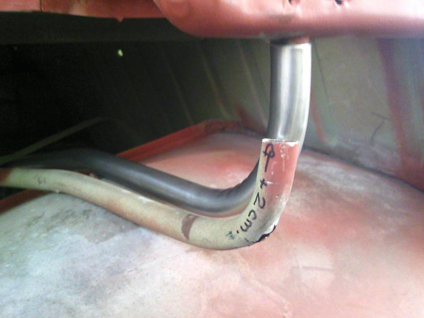 Bon il fait vraiment trop froid pour le garage plein vent ou se trouve le bus, j'ai présenter le tuyau de trop plein de la goulotte d'essence que j'avais fait refaire en inox, il va y avoir de l'ajustage mais ça devrait le faire.