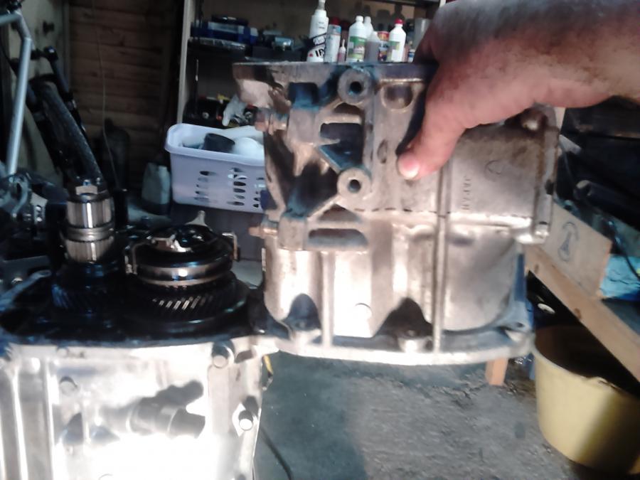 voici le carter arriere où est enfermé le diff central il y a une cloison au milieu , en pointillé au marqueur là où je vais découper le carter vu que le diff central saute on peut raccourcir le carter , y a un peu de taf pour faire différents bouchons et boucher quelques trous mais rien d infaisable ainsi raccourcie la boite sub a presque la même taille que la boite vw ,il n y aura pas de trop grosses modifs pour la fixer
