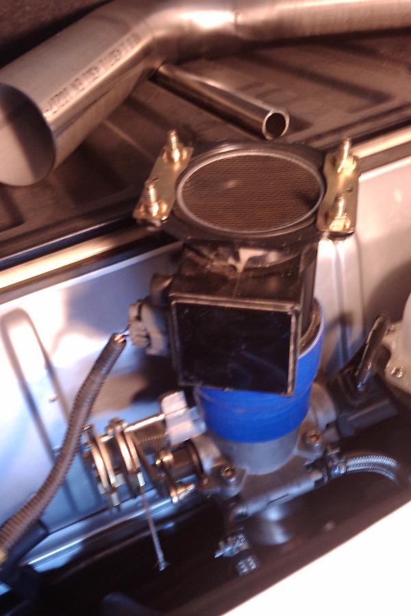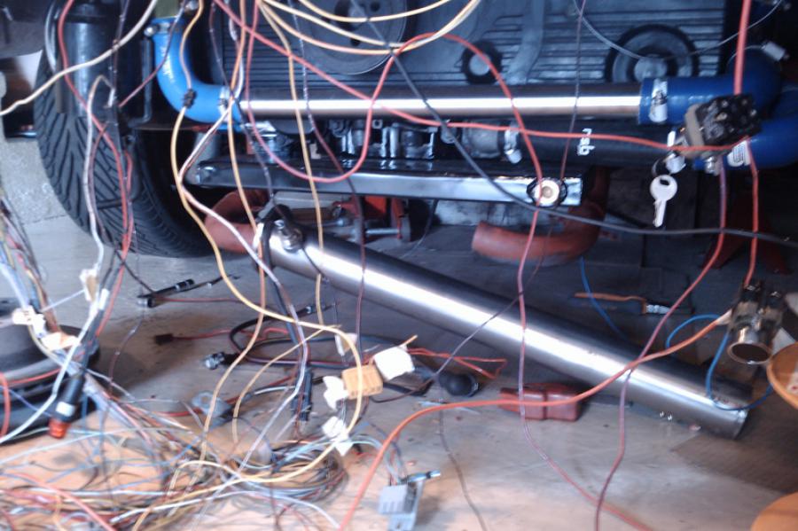 J'ai donc continué mon montage "gitan" de test : fils volant, câblage à la cosse, débitmètre juste fixé sur une durite et échappement pas fini (2 morceau de l'ancien collecteur en échappement libre). Le tout géré par 2 interrupteurs d'armoire électrique... un joli bazard, juste pour valider mon élec et être sûr de pouvoir utiliser ce calculateur!