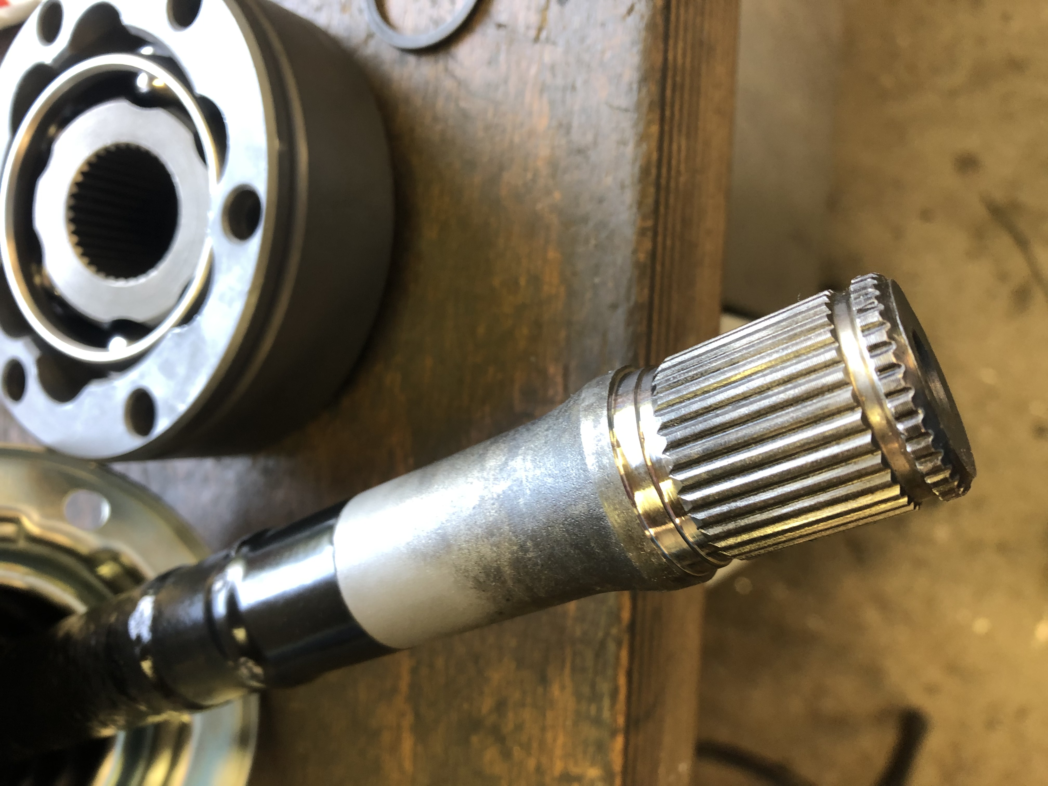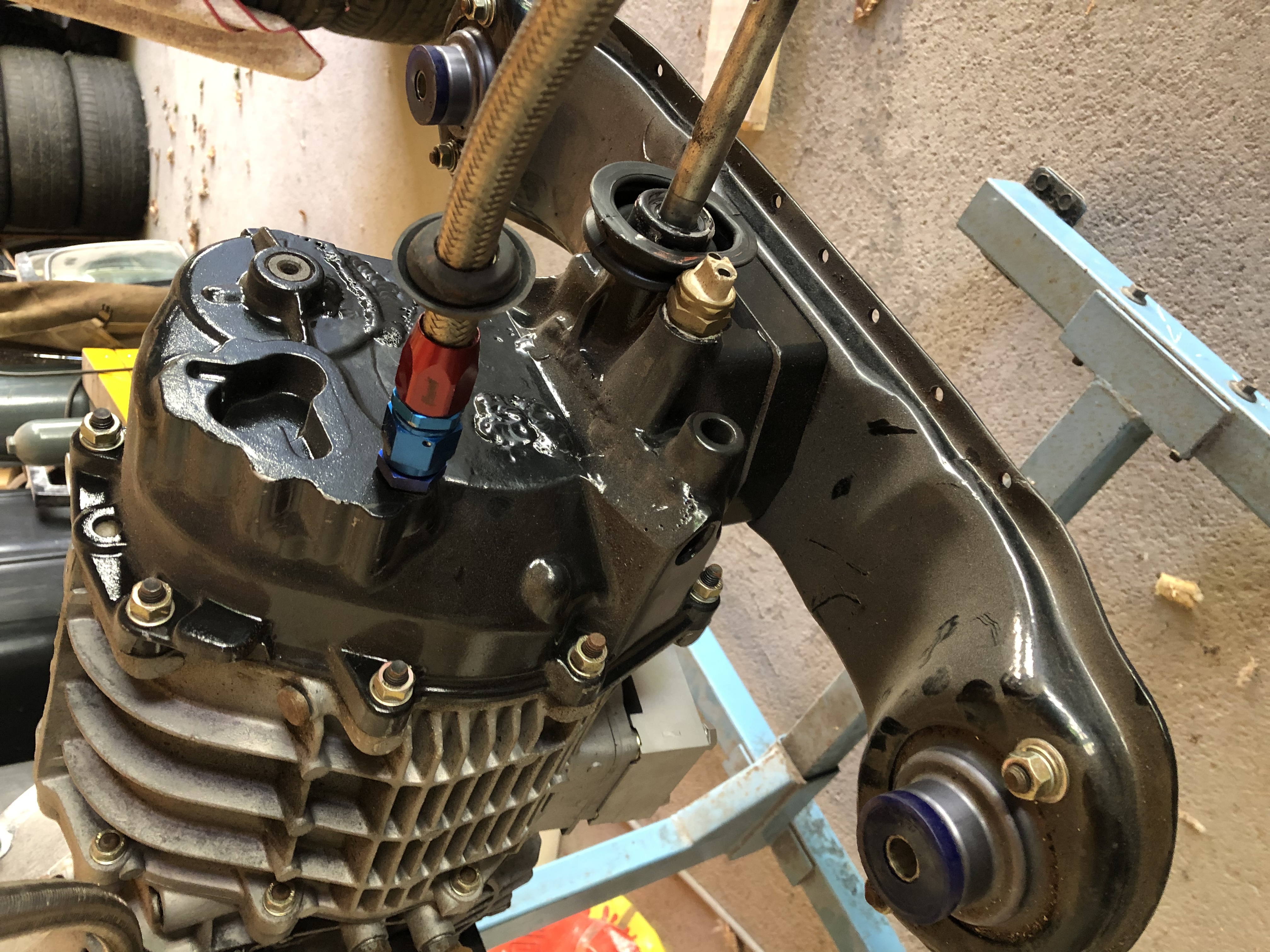 La boite 915 avec son injection d huile, autobloc, et tout et tout est dedans. Les cardants provisoires « cox » sont passés par la case usinage pour recevoir les noix de T2 en 100mm Du coup, sur ses roues trains roulants montés, elle a pris la direction de la carrosserie
