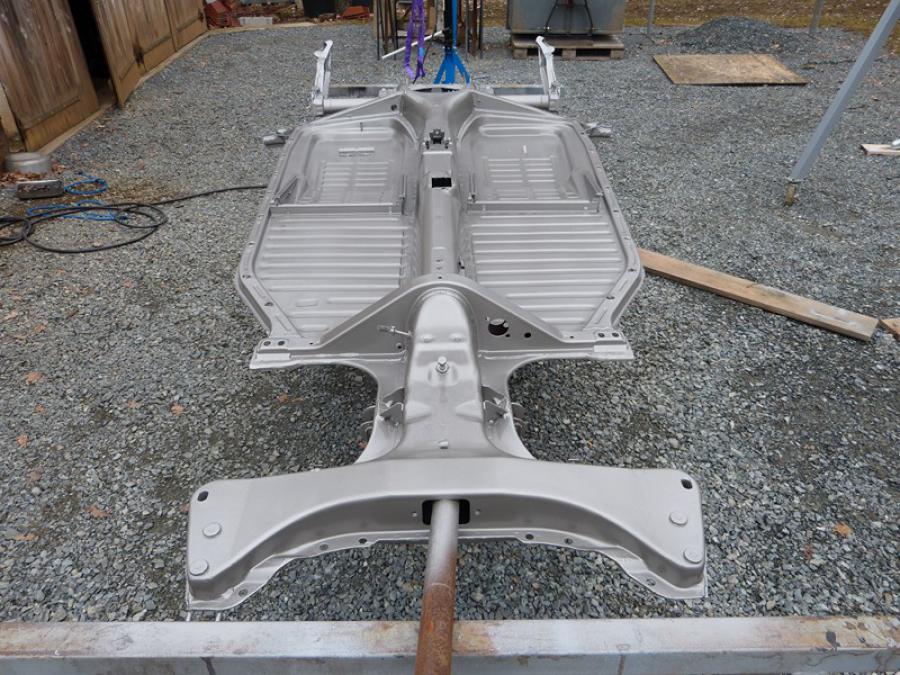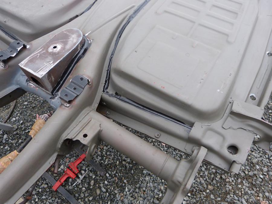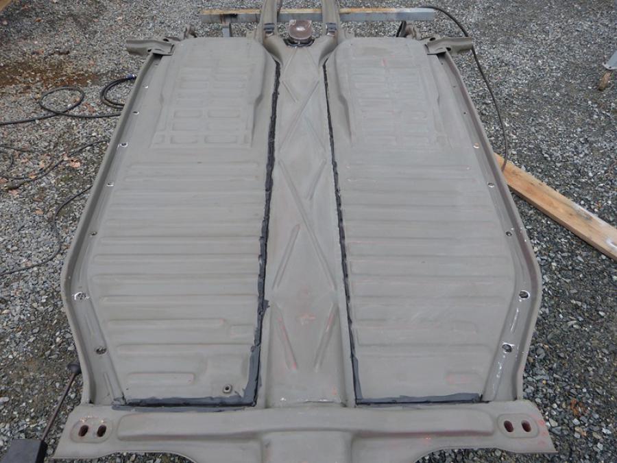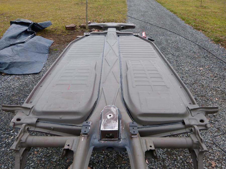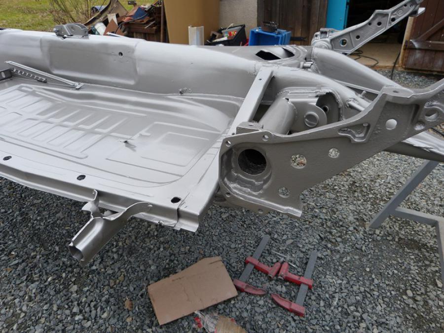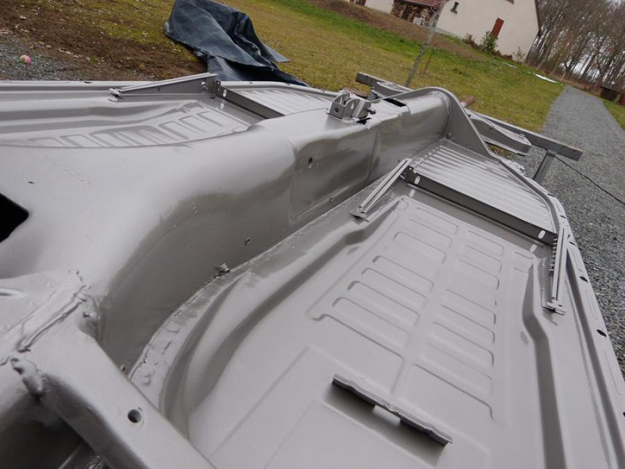 Présentation du bouzin maintenant que tout est soudé et traité, je démonte tout et je fait les joint d’étanchéité et passe une couche d'apprêt garnissant sur le dessous du chassis