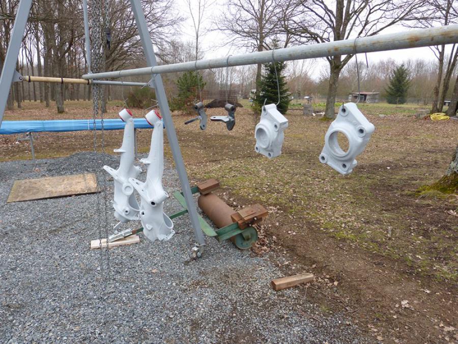 Samedi matin je ponce l'apprêt garnissant sous le chassis et une fois fini je le retourne histoir de mettre une tartine de garnissant et de joint PU sur le côté intérieur. au passage le levier "219" patte du tryptique j'ai mis sécher mon linge
