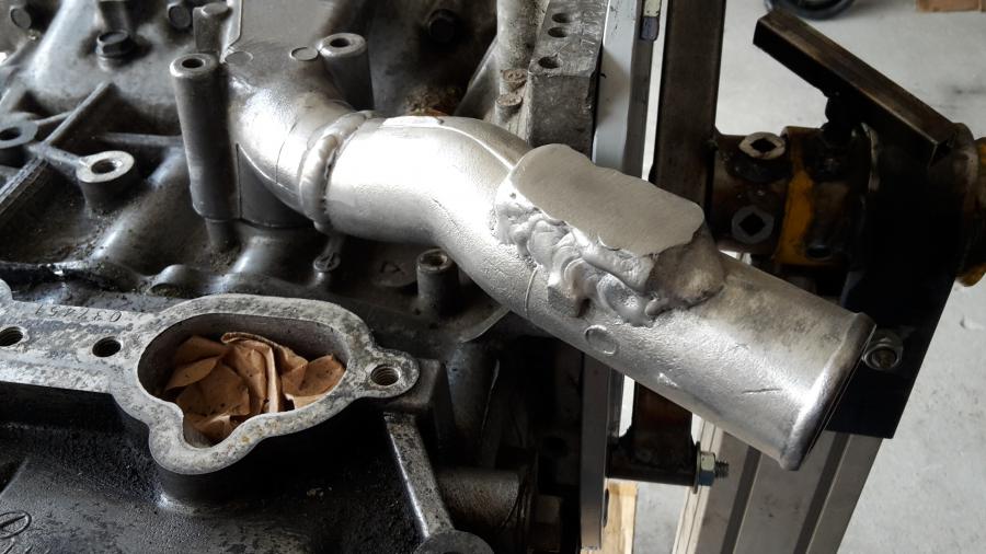 La pipe d'eau retournée -la fameuse "reverse manifold"- est revenue de soudure. Il me restera à la percer, tarauder pour les sorties supp, et avec une belle peinture, elle sera finie!