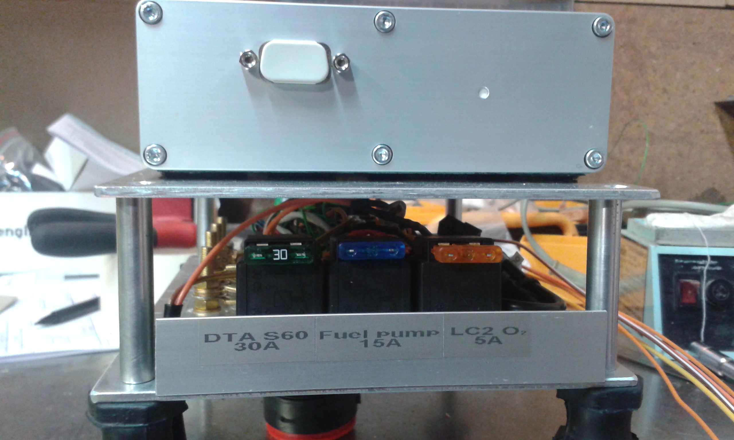 Pour que tous les éléments soient au même endroit j'ai créé une platine à 2 étages, le premier reçoit les relais, fusibles, capteur barométrique, l'Innovate LC2 (sonde lambda) et les jonctions communes. Le deuxième étage reçoit le calculateur DTA S60. Ce module se trouvera derrière la banquette côté conducteur pour relier tout ce petit monde au moteur j'ai choisi un connecteur Deutsch à 31 voies étanche de la gamme industrielle/PL/agricole car la gamme Motorsport est vraiment plus chère, surtout l'outil de sertissages des pins qui avoisine les 600€! La tôle au dessus de la boite de vitesse est percée pour fixer la partie de la prise fixe, il y aura que 2 prises pour enlever le moteur: le connecteur Deutsch et la prise de l'alternateur.