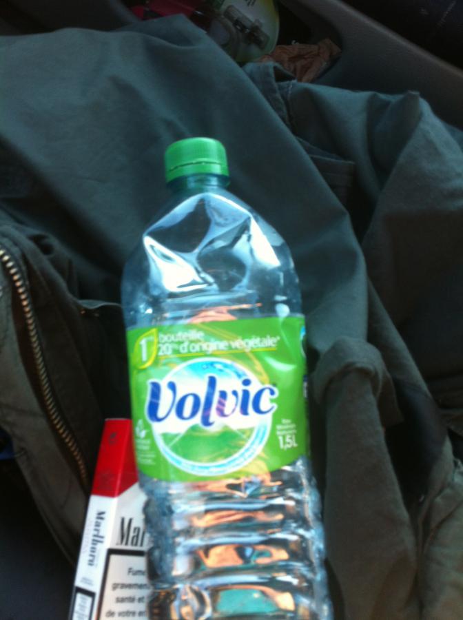 une bouteille de volvic et un bout de métal sur des roues de diable...