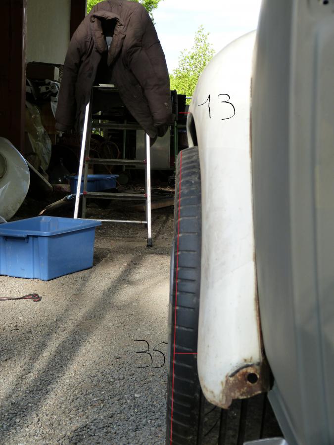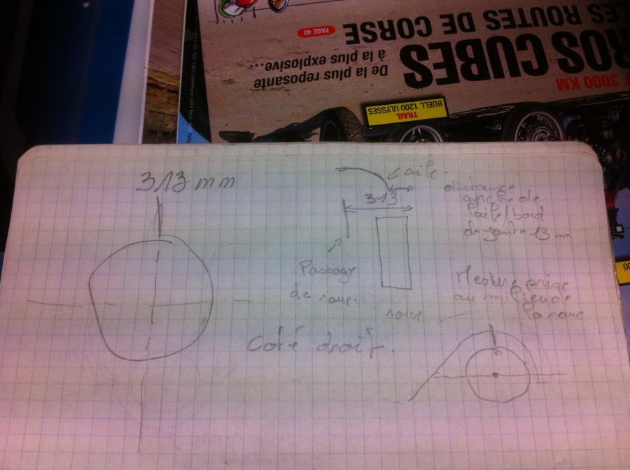 Donc j'ai pris comme mesures l'ecart entre le bord extérieur au sommet de l'arche de l'aile et le bords de la jantes, puis de même au niveau du bas de l'aile (a l'arriére) et pareil en avant de l'aile au niveau du marche pied. au sommet de l'arche 13mm de décalage