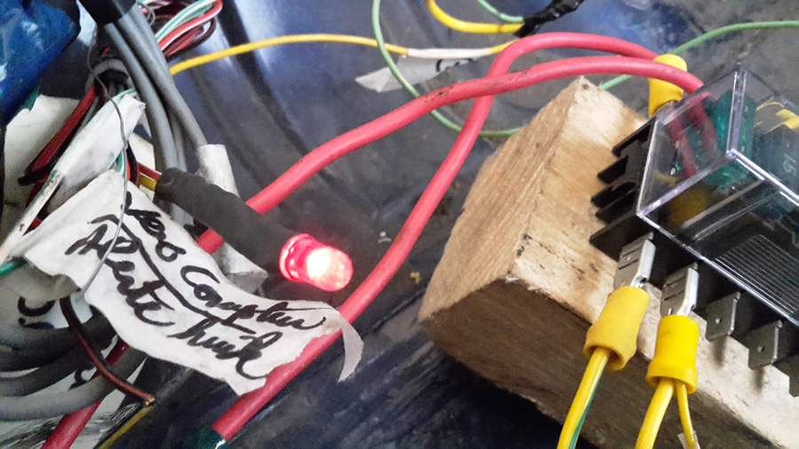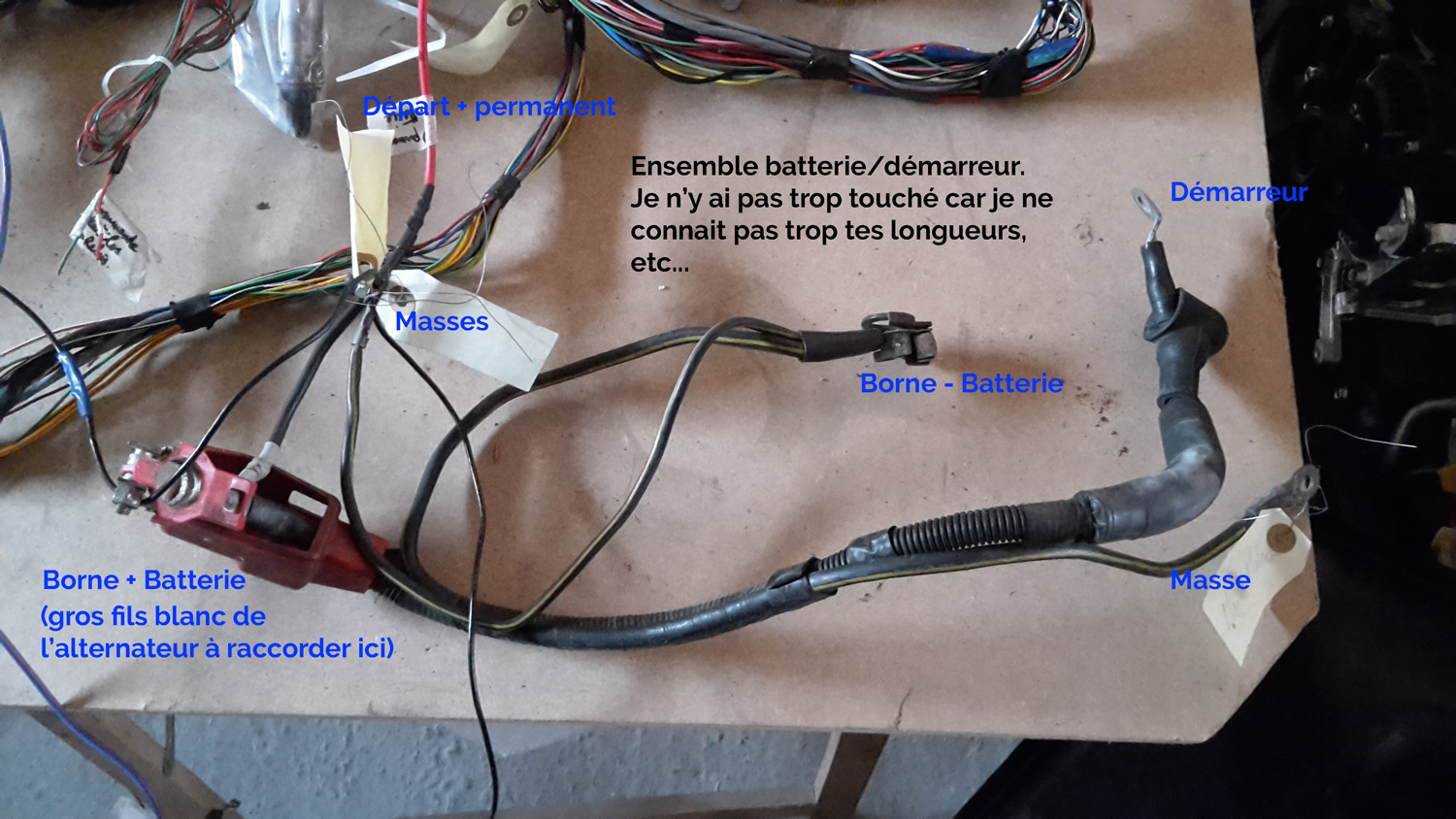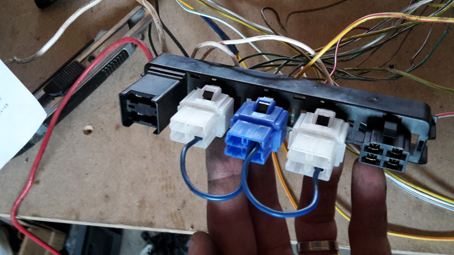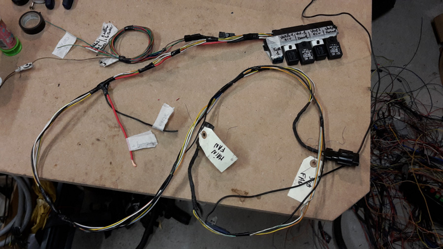 L'auto donneuse étant une auto de rallye, les ventilos étaient montés en direct contact. Ils devaient donc tourner tout le temps, sans relais ni fusibles. Donc on coupe tout, en on refait un truc plus adapté au Notch. Retour des 4 relais, mise en place de fusibles, et 4 commandes sont dispos : le calculo commande les 2 ventilos en vitesse 1, et 2 fils permettent de connecter deux inters au tableau de bord, pour forcer les vitesses 2 manuellement. En bricolant avec des diodes sub récupérées dans la boite à miracle électriques, ça marche nickel. Vue de l'ensemble : Encore un peu de scotchage et de nettoyage, et le faisceau retrouvera le notch!