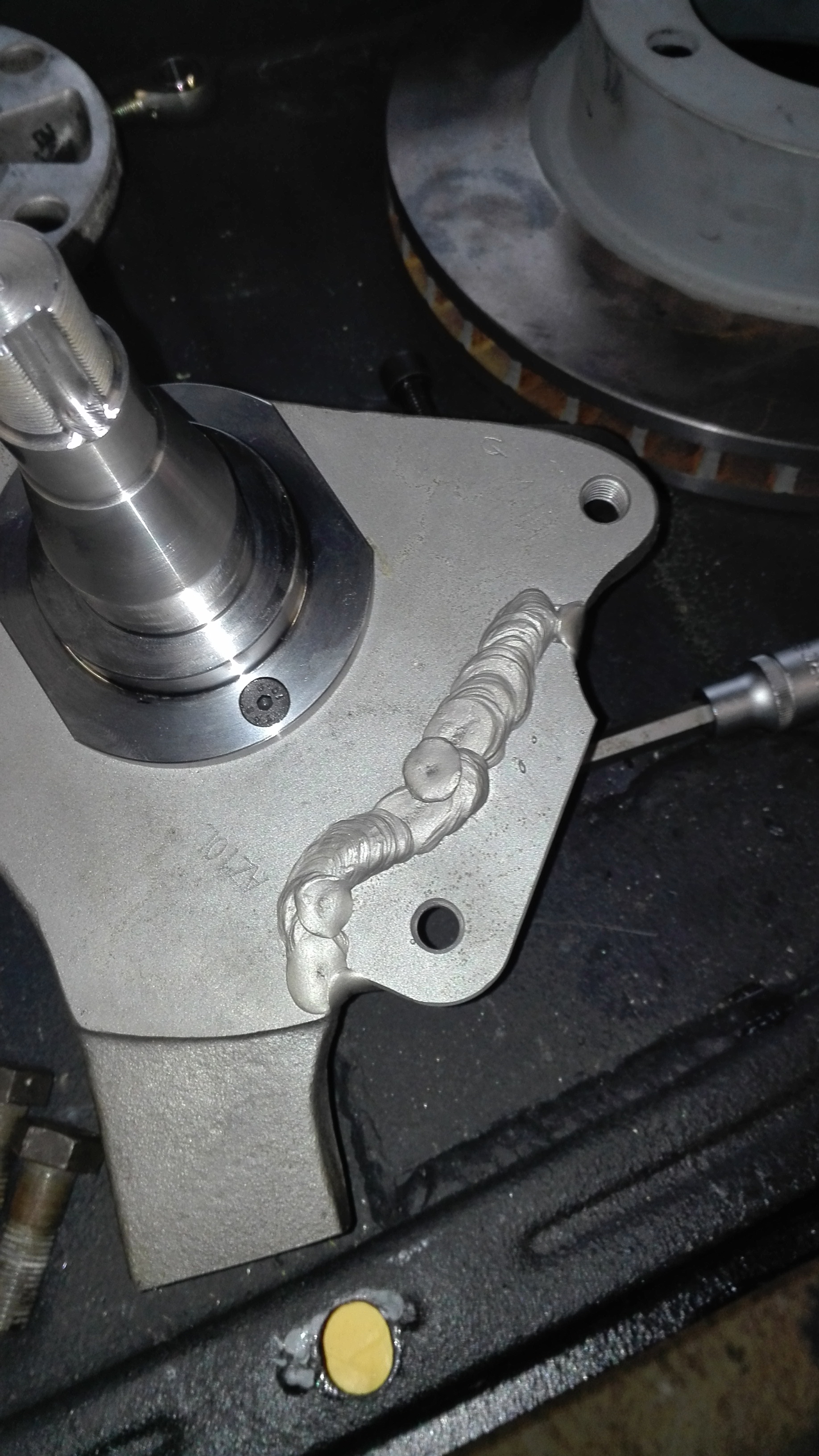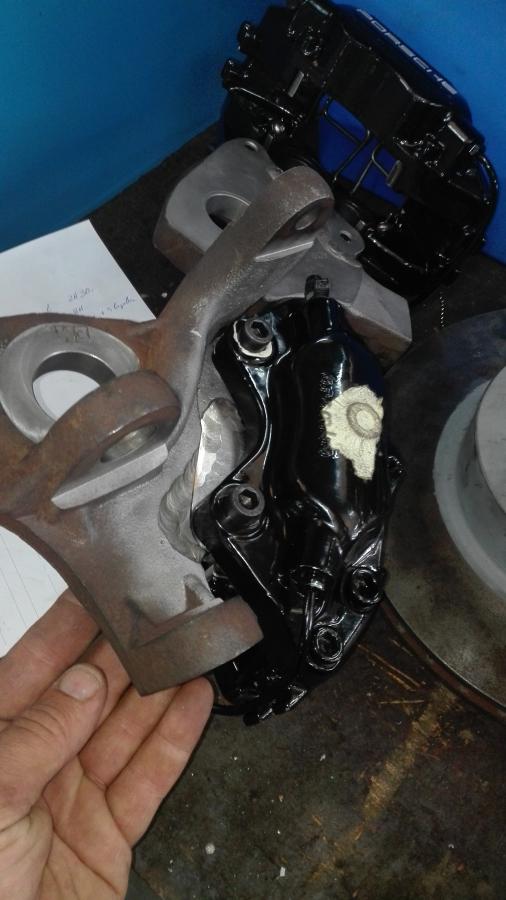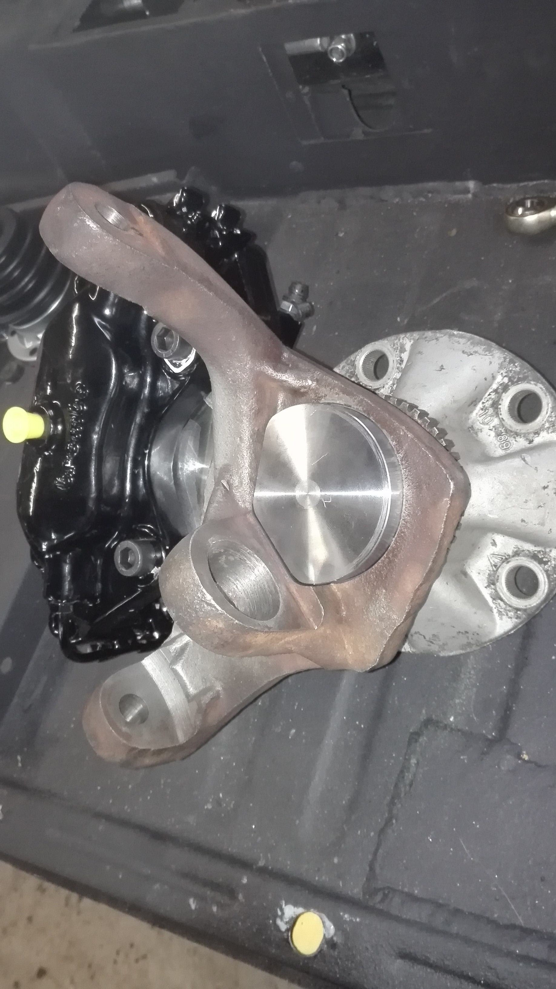 Ca se précise, freins avant quasi finis , j ai viré l axe de fusée d origine et fais refaire des axes sur mesure pour monter les moyeux 944 turbo phase 2 a gros roulements, ca risquera pas de bouger , disques en 28*300