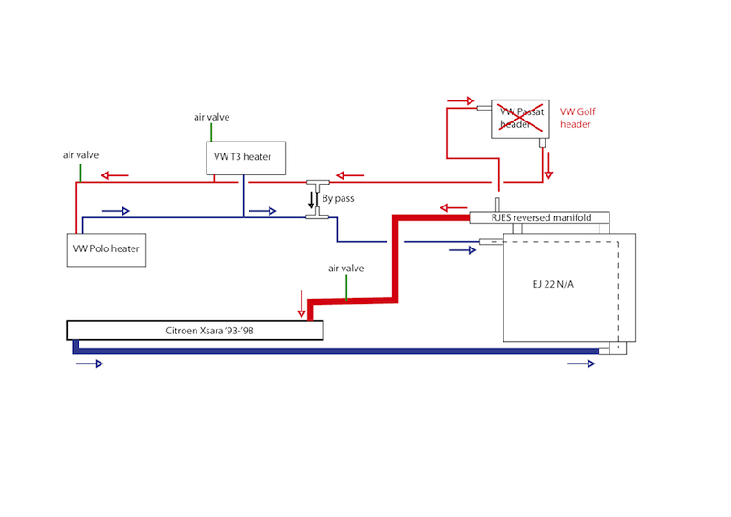Je fais une parenthèse sur le bypass, il ne se monte que dans le cas ou tu as un radiateur VW à l'avant avec le chauffage VW, il sert quand on utilise pas le chauffage pour que l'eau chaude continu à circuler sinon cela augmente la température d'eau du moteur car le système de chauffage du Sub est différent du VW…