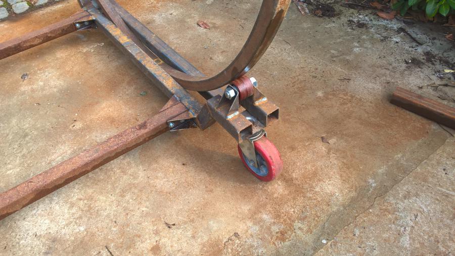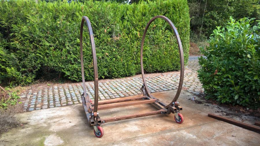 Voilà la rôtissoire, 360* de rotation, version mobile avec les grandes roues industrielle pour la transporter chez le sableur ou le peintre, 2m de haut et 1,9 de large , ca rentre dans une remorque plateau sans soucis, il me reste à presenter la voiture dedans pour faire les supports amovibles qui permettront de mettre la coque, le chassis où les deux en même temps , mais c'est pas pour tout de suite car je sais plus bouger scooby, roulements de moyeu av arraché, c'est de ma faute, il était déjà loin quand j'ai acheté la subaru et je l'ai laissé longtemps sur son poids sans cardans fixé, ca devait arriver ;)