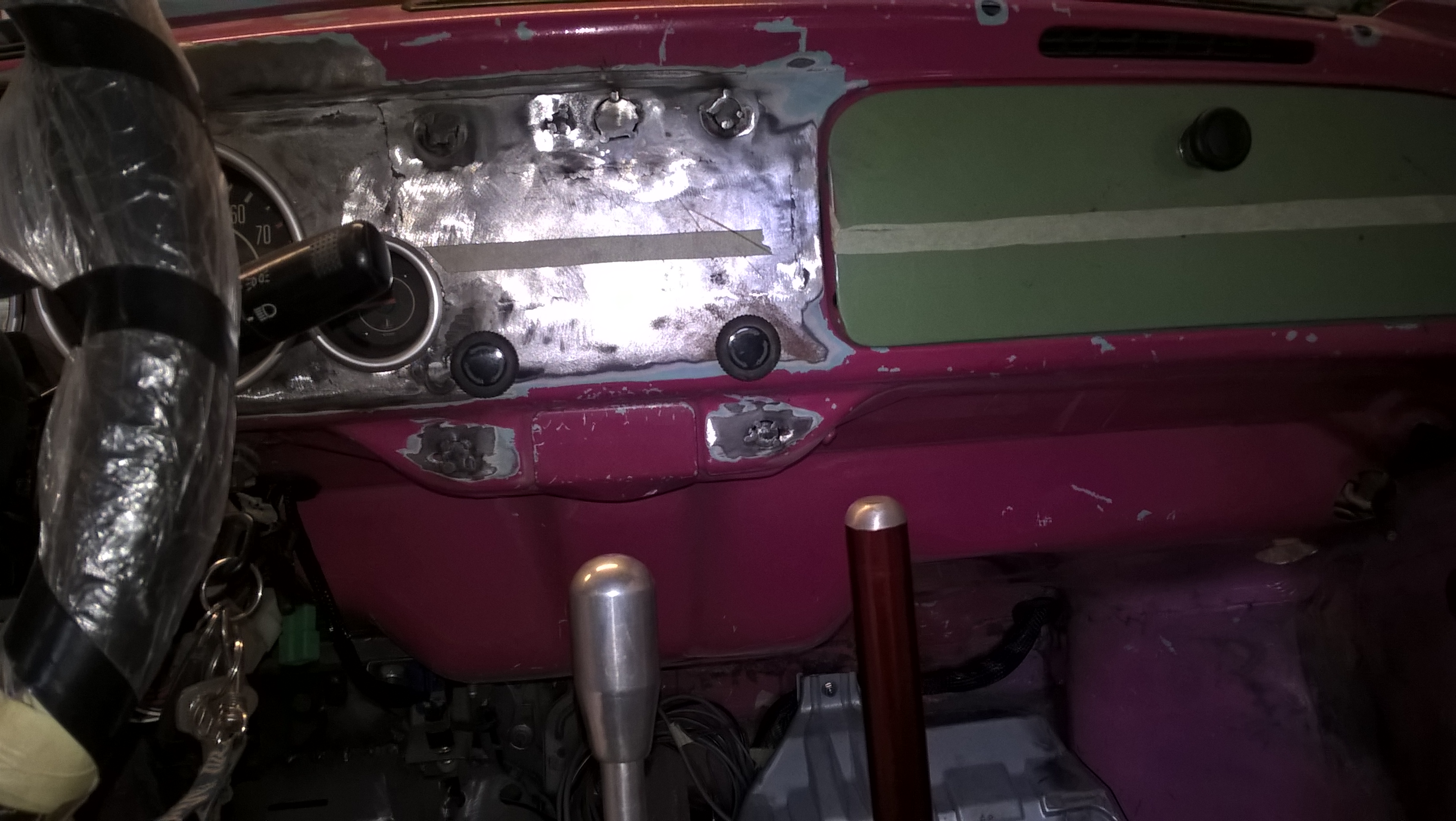 Sinon j'ai aussi rebouché tout les trous inutiles du tableau de bord, rétrécis de 15mm la commande de ventilation car j'en ai besoin pour un truc ;) mais mon compteur était juste devant un des trous, donc on coupe et on soude ;)