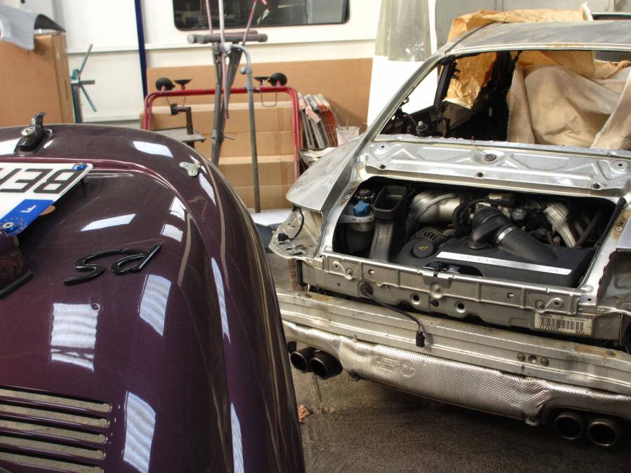 Le capot pour fermer l'avant que j'ai bizoté pour éviter d'avoir à reculer la boite ou a taper dans la coque... Une fois en place avec le support de boite la découpe pour le démarreur et le trou rebouché La totale!!! Toujours en charmante compagnie.... une complète pour la 997... Et en fin de journée... in da place!