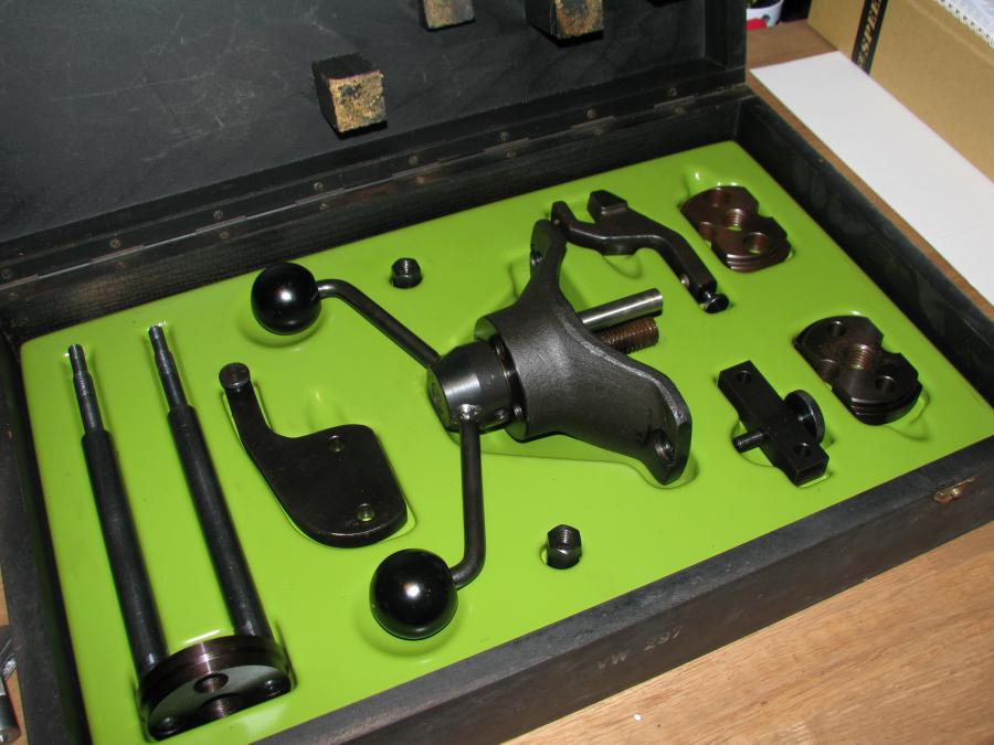 Sinon j'ai un peu avancer sur l'outillage pour faire correctement ma boite 5. D'abord fabrication d'un extracteur du pignon conique histoire de remplacer mon cric: J'ai aussi trouvé deux outils facilitant le réglage de l'ensemble couple conique/différentiel en Allemagne, VW289d & VW297 NOS: