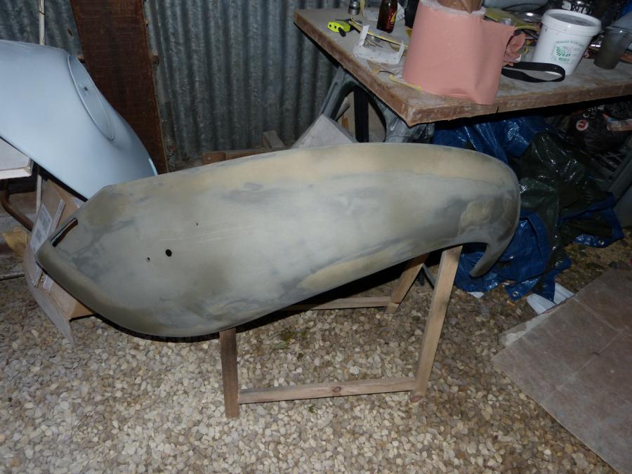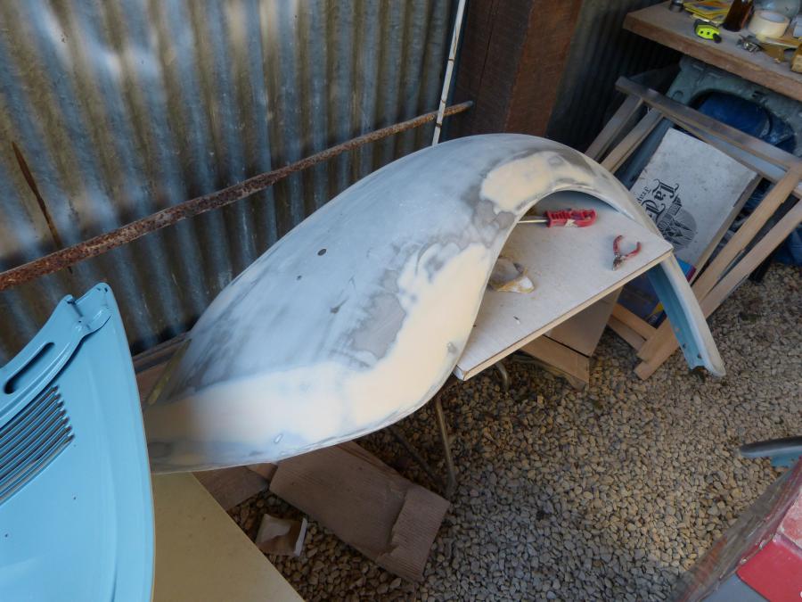 Bon hier je suis rentré de bonne heure du boulot, du coup j'ai posé mes derniers mastiques de finitions sur mes ailes arrières. En attendant que ça polymérise j'ai poncé au 400 mon capot arrière en vue de le peindre bientôt, une fois fini je ponce les ailes arrière.