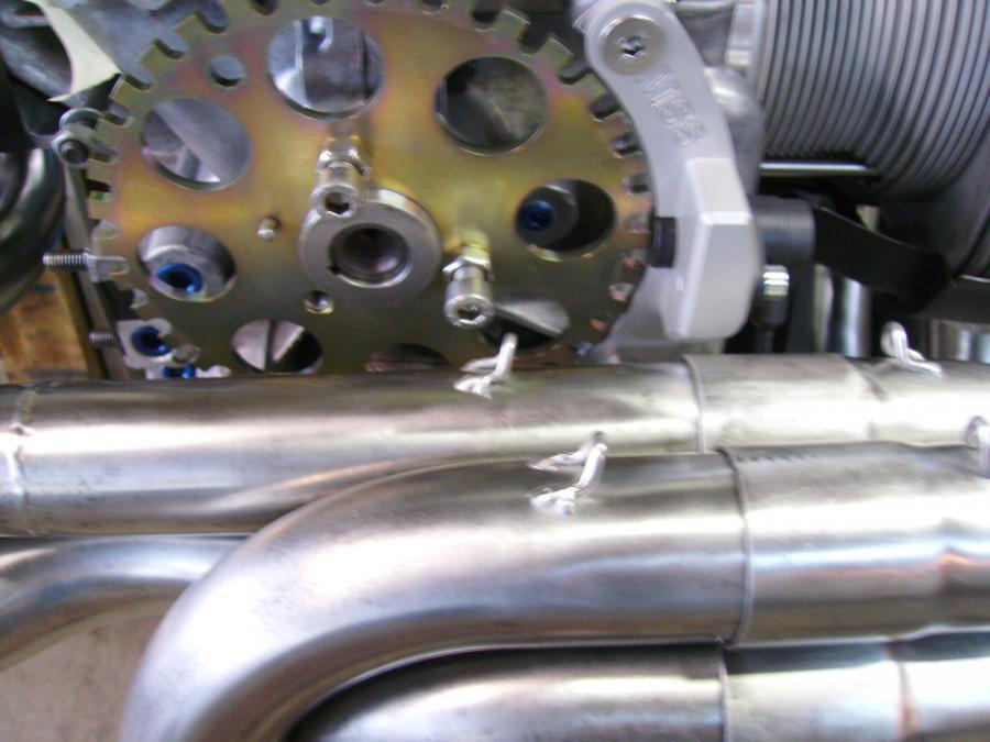 Comme d'habitude rien ne se passe comme prévu, l’échappement est monté à blanc, il a été modifié pour la largeur du moteur mais le capteur de la roue dentée de vilo ne passait pas, j'ai du modifier le bas du support mais ça ne me plait pas, le capteur se trouve trop près de l’échappement, il devrait pas durer longtemps et vu le peu de place disponible faire un écran par chaleur est exclut.