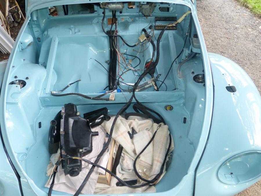 Donc il étais prévu au programme refection totale du faisceau électrique, soudure mastique apprêt et peinture du capot avant, démarrage du moteur, et remontage au maximum de la voiture.