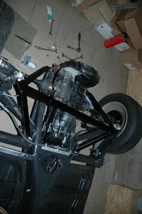 J'ai aussi réalisé un renfort de train arrière en tubes acier rectangulaire, il est non réglable car, comme il a été fait sur ma caisse, il est parfaitement adapté à celle ci, par contre il n'est plus démontable sans enlever la carrosserie du châssis.