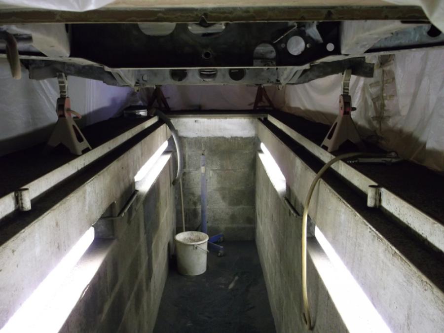 a l heure actuelle je suis en mode sablage du dessous ( avec la fosse reconvertie en cabine de sablage ) et comme entre temps je n ais pas pu prendre en photo le bas de caisse fini, du a un probleme d'apn , j en profite :