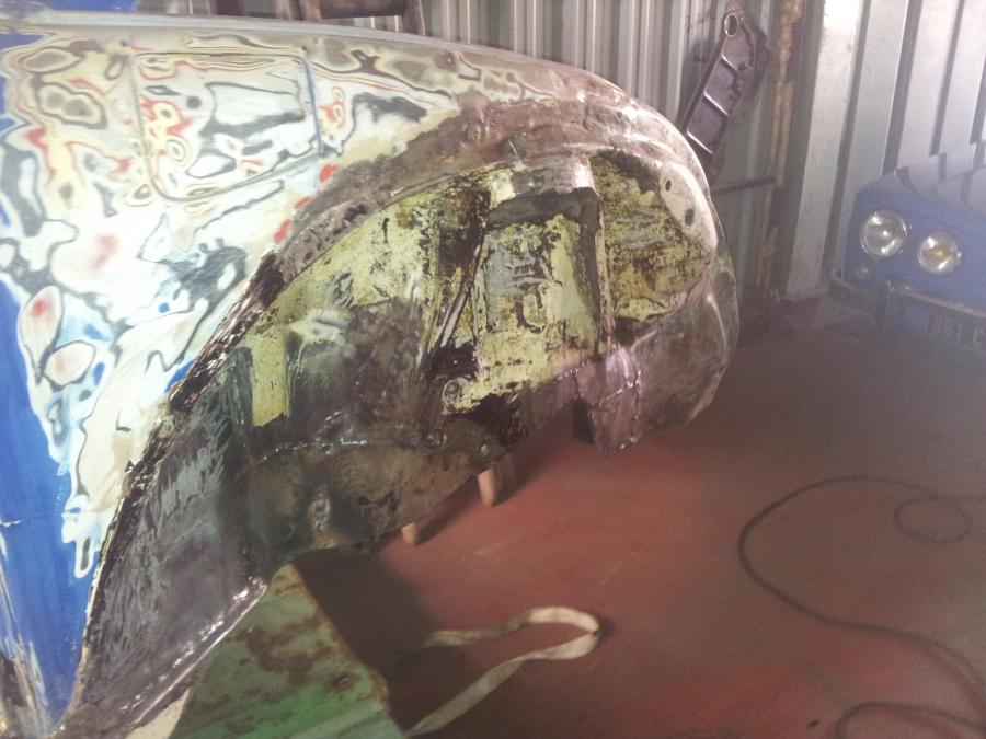 Puis on re-sable à nouveau, on passe du rustol, joint entre les jointures de tôles, noir à châssis, puis peinture: