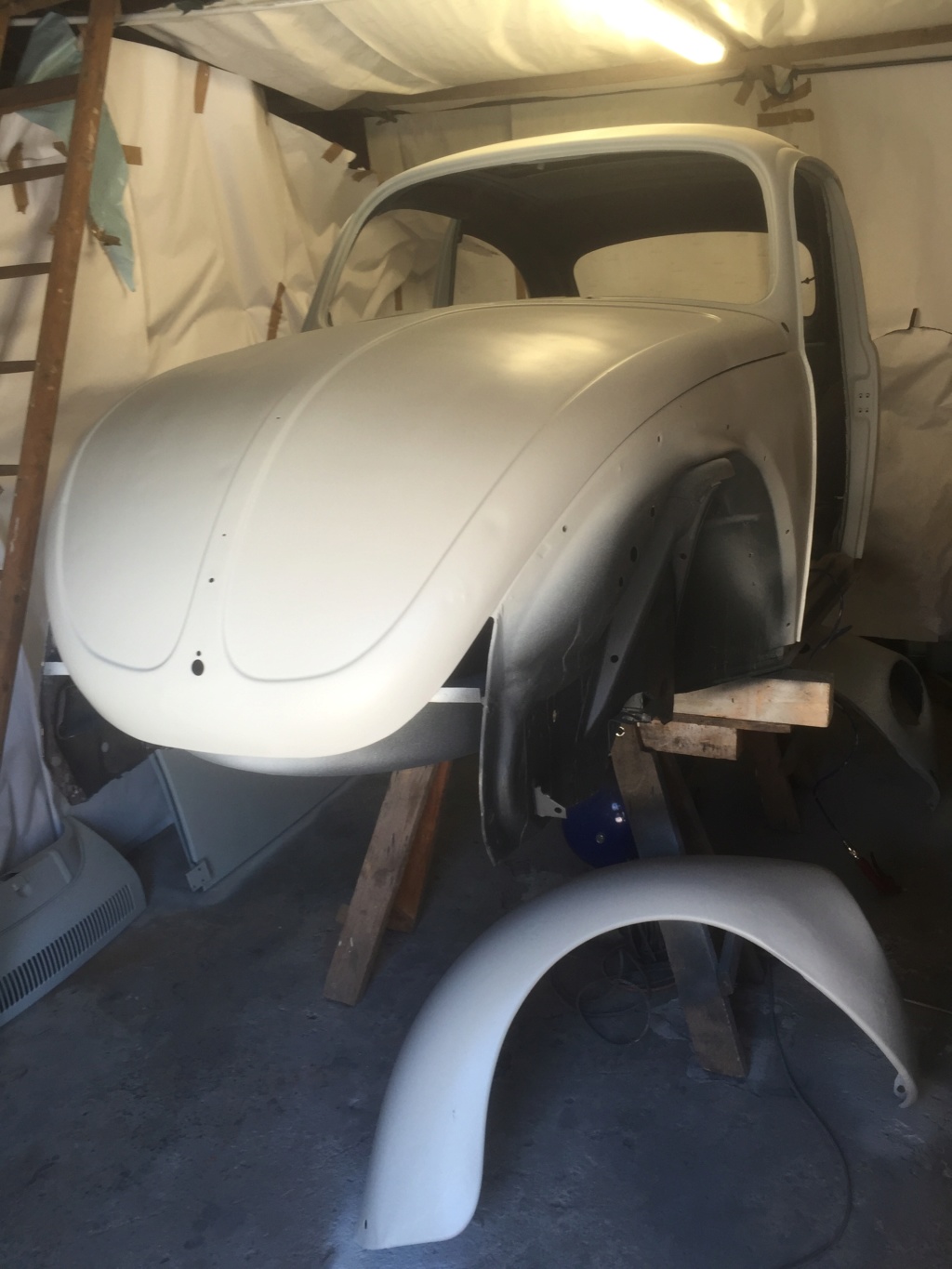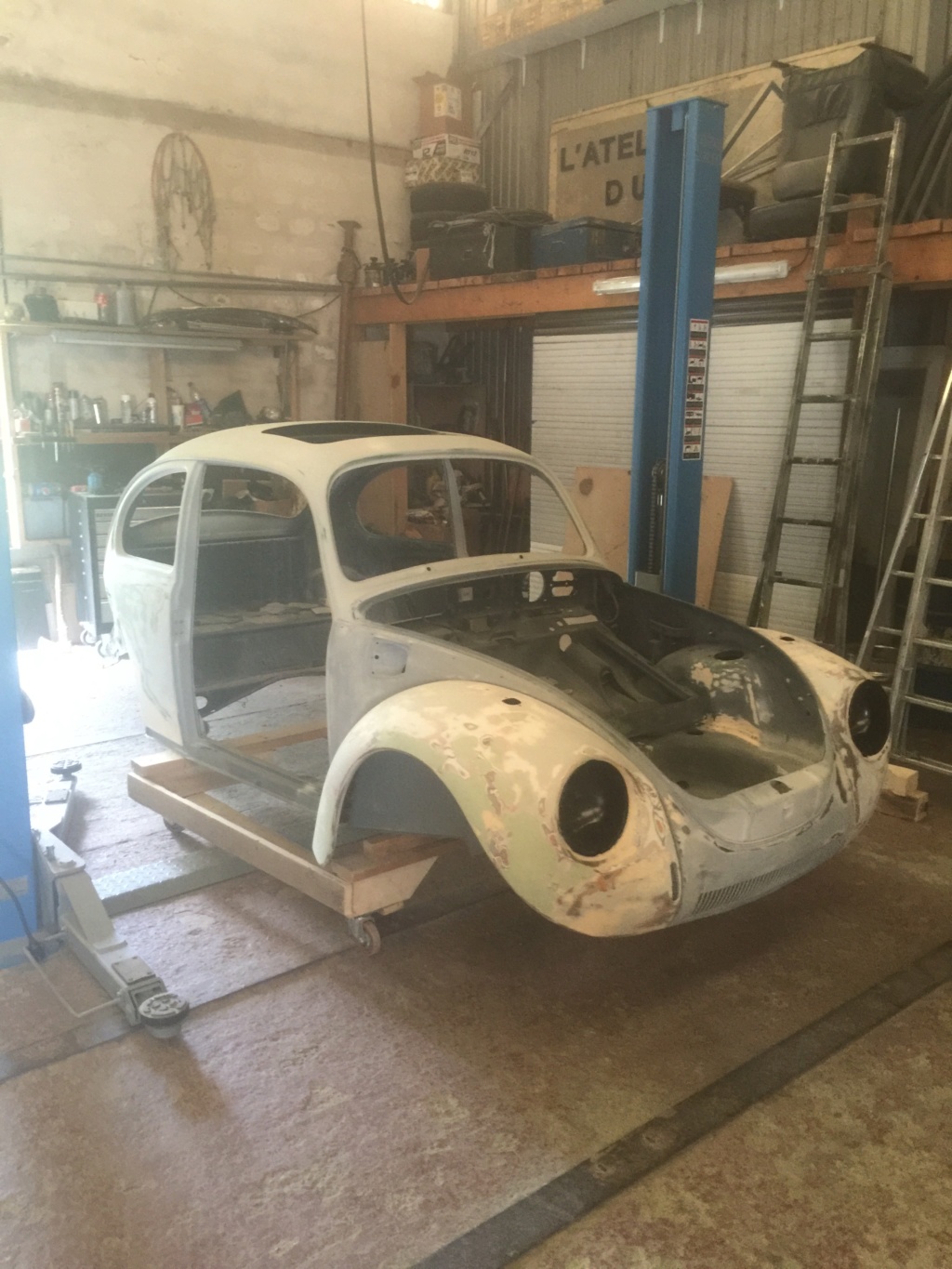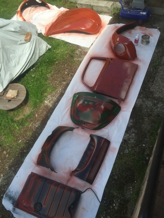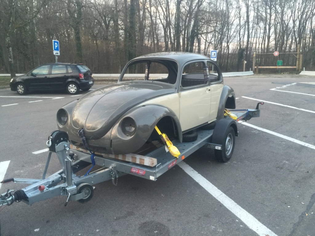 Et zou, sur la remorque direction le carrossier/peintre pour les finitions mastic et peinture (plateau pas dispo on prend la remorque au padré, ça fait aussi, faut juste pas croiser la volaille)