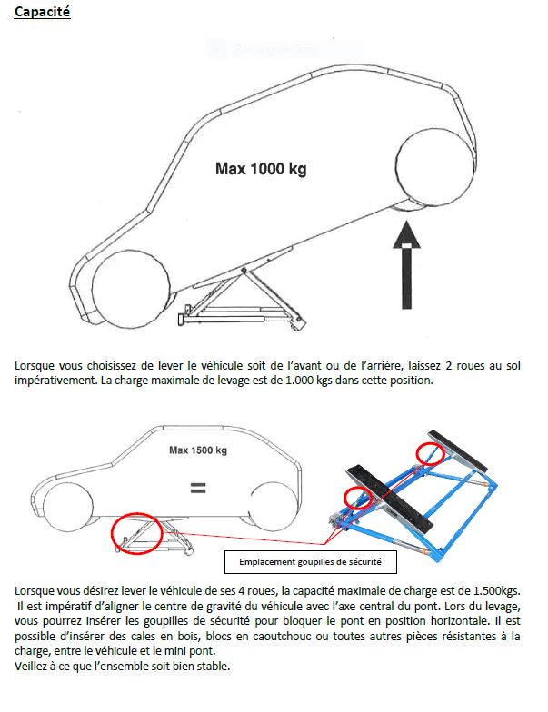 https://www.mecatechnic.com/fr-FR/pont- ... %27atelier Ce n'était pas clair au début mais après avoir lu la notice d'utilisation , il semble qu'il soit possible de soulever totalement une voiture de type cox ( 1500kg max ). Avec évidemment des protections supplémentaires ( des chandelles aux 4 coins ) pour 200% de sécurité ... ma norme à moi.
