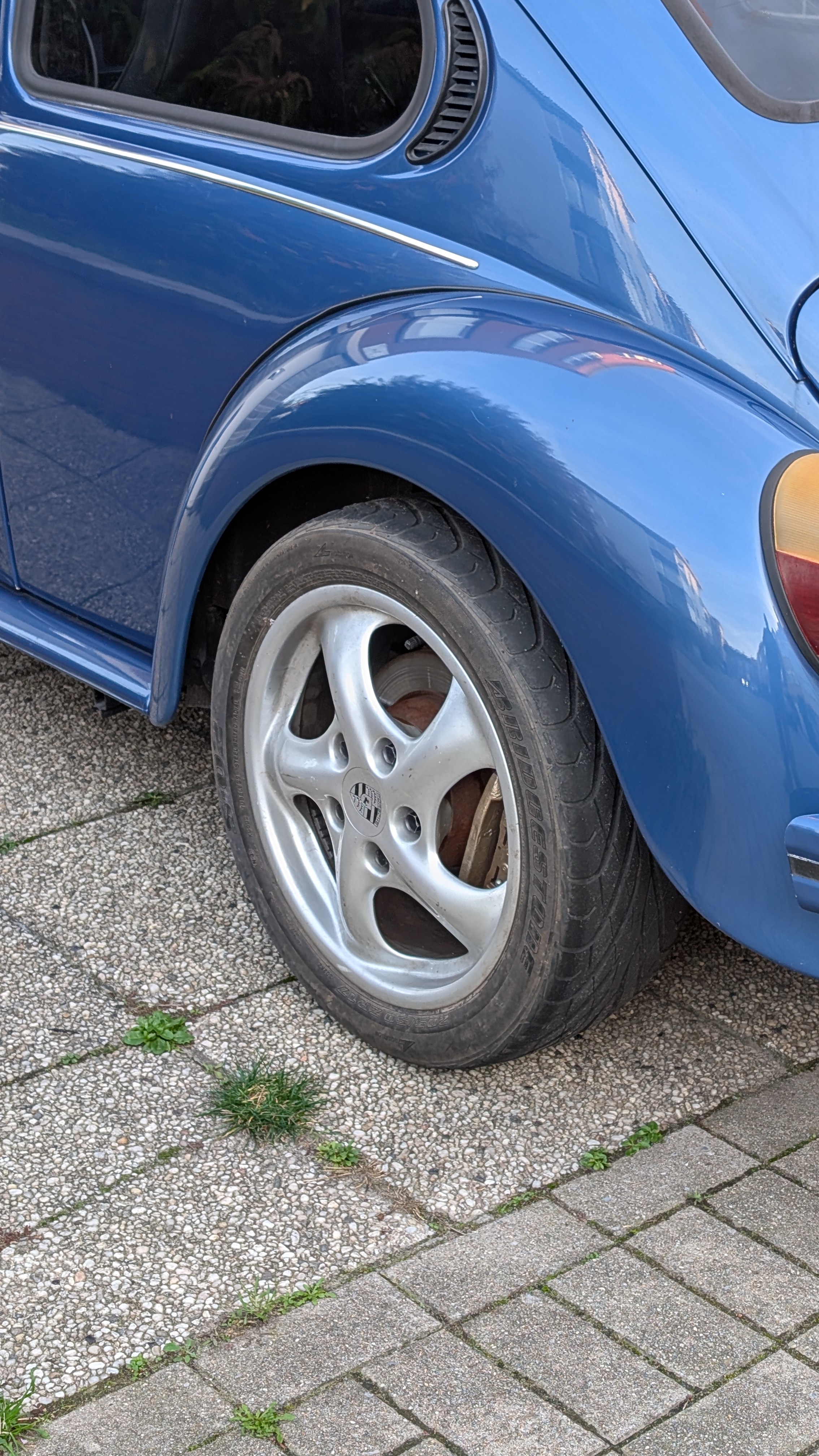 J'ai changé les roues à l'arrière, j'ai posé les 2 jantes Boxster 986 ( des avant ), des 17/7/55 équipées de 205/50 assez vieux et très très usés.
